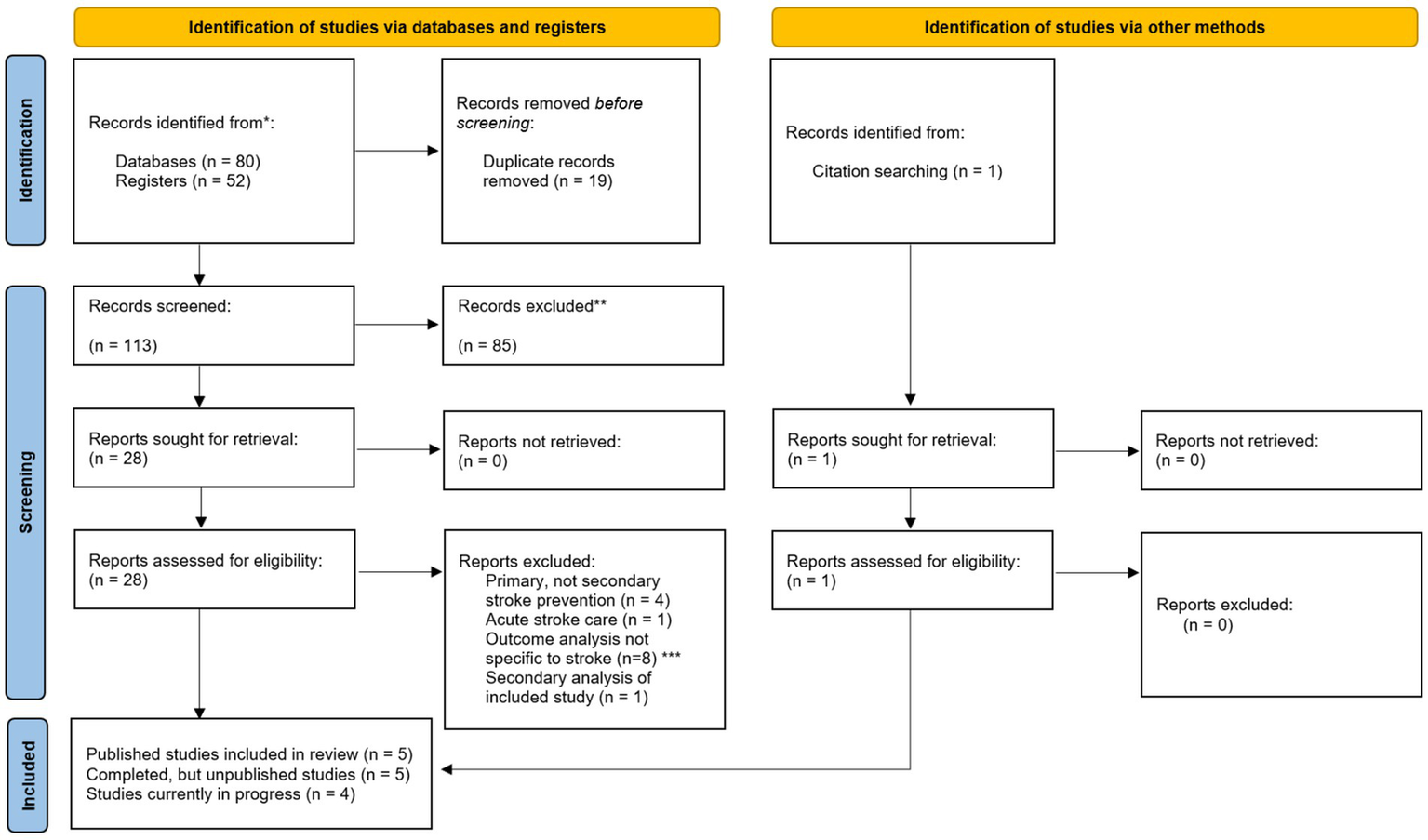 Figure 2. PRISMA diagram (Preferred Reporting Items for Systematic Reviews and Meta-Analyses) including searches of databases, registers and other sources. *Databases included Ovid MEDLINE/PubMed, EMBASE, and CINAHL. Trial registers included ClinicalTrials.gov and International Standard Randomized Controlled Trial Number (ISRCTN). This included all studies submitted to the trial registers and/or published from database inception until 12 March 2024. **Reasons for record exclusion include studies that examined primary stroke prevention, did not include outpatient visits in the intervention, or did not examine stroke-specific outcomes. ***Outcome analysis not specific to stroke included any composite cardiovascular outcomes that included conditions outside of stroke (e.g., Sudden cardiac arrest).