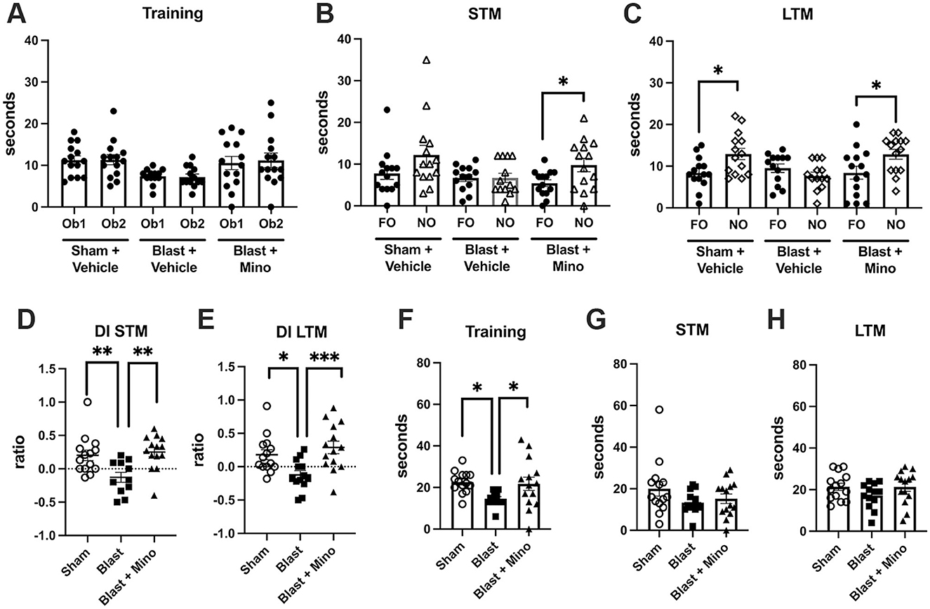 In NOR testing of cohort 2 during training all groups spent equal amounts of time exploring the objects (Figure 7A). In STM testing blast + minocycline explored the NO more than the FO while sham and blast + vehicle explored them equally (Figure 7B). In LTM testing, sham + vehicle and blast + minocycline explored the NO more than the FO while blast + vehicle explored them equally (Figure 7C). When a DI was calculated for the STM (Figure 7D) and LTM (Figure 7E) testing, deficits in object recognition in the blast + vehicle were rescued by minocycline in the blast-exposed in both. Blast +vehicle also spent less total time exploring the objects, an effect that was restored in blast + minocycline (Figure 7F). All groups spent equal total time exploring the objects in the STM (Figure 7G) and LTM (Figure 7H) testing.