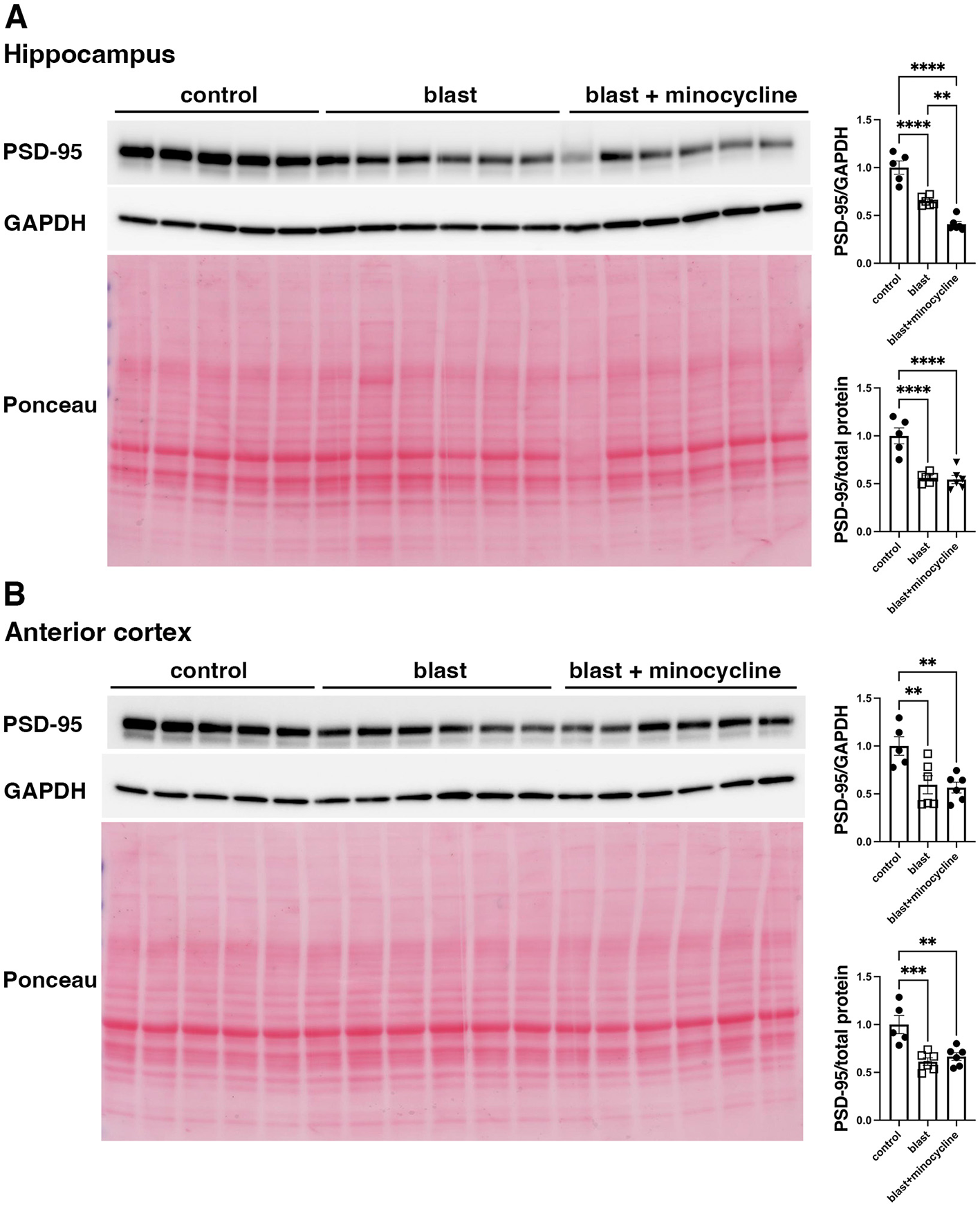 Western blot analysis of PSD-95 in rats from cohort 2. PSD-95 was analyzed in hippocampus (A) and anterior cortex (B) of control rats treated with saline (n = 5), and blast exposed rats treated with saline (blast) or minocycline (n = 6). Top panel: PSD-95; middle panel: GAPDH and bottom panel Ponceau S stain. The targets were sequentially analyzed on the same blot in the same order as indicated in the Figure. The bar graphs show PSD-95 levels expressed as a ratio to GAPDH or total protein load calculated from Ponceau S staining. Error bars indicate the SEM. Asterisks indicate significant differences (Fisher's LSD after a significant one-way ANOVA, **p < 0.01, ***p < 0.001, ****p < 0.0001).