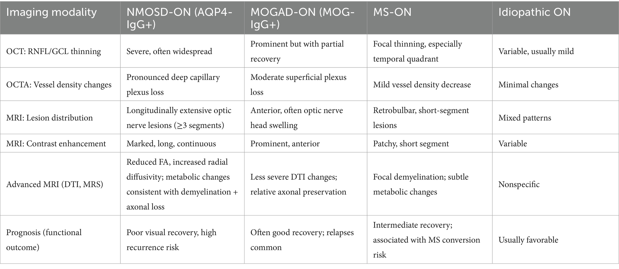 In line with these findings, it has been observed that despite severe acute vision loss, MOGAD-ON often retains relatively preserved GCIPL thickness (mean reduction 14 μm), in contrast to NMOSD-ON eyes, which show markedly greater loss (mean reduction 28 μm, p = 0.008) (31). Recent comparative reviews and cohort analyses provide consistent evidence that MOGAD-ON is frequently bilateral at onset, associated with pronounced optic disc swelling, and followed by variable but sometimes modest chronic GCIPL loss despite profound acute deficits. By contrast, AQP4-IgG + NMOSD-ON is characterized by severe and diffuse chronic pRNFL and GCIPL thinning after attacks, with average chronic pRNFL values often <80 μm, whereas MS-ON more commonly shows temporal-predominant RNFL loss (19). These modality-specific signatures support the use of OCT-guided triage for serologic testing when clinical features are ambiguous (Table 1).