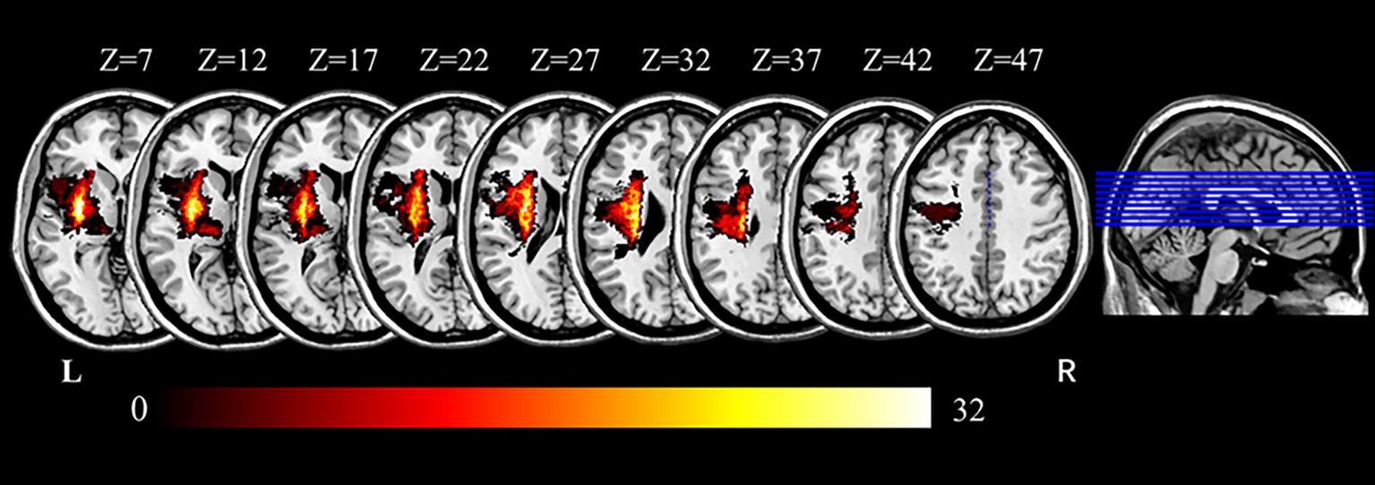 Figure 1. Overlap map of stroke lesions across all participants. Color intensity indicates the number of patients with overlapping lesions at each voxel. Axial slices are displayed along the z-axis from slice 7 to slice 47 in Montreal Neurological Institute (MNI) space (MNI, Montreal Neurological Institute; R, right; L, left).