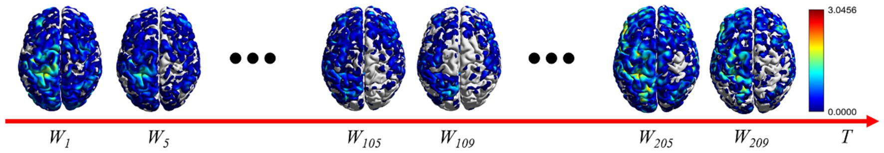 Figure 2. DFC maps across different sliding windows for a representative participant. Each map illustrates the time-varying connectivity between the left primary motor cortex (M1) and other brain regions. The color bar denotes Fisher’s Z-transformed correlation coefficients (T, time; W, window).