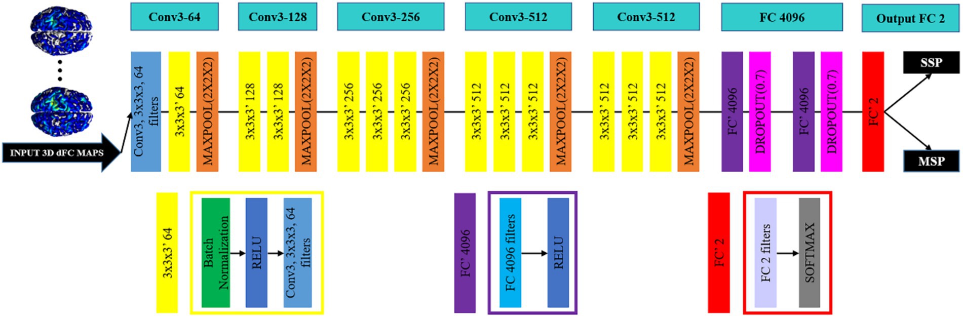 Figure 3. VGG-Net-based 3D-CNN architecture. SSP, severely stroke patients; MSP, mild stroke patients; dFC, dynamic functional connectivity.