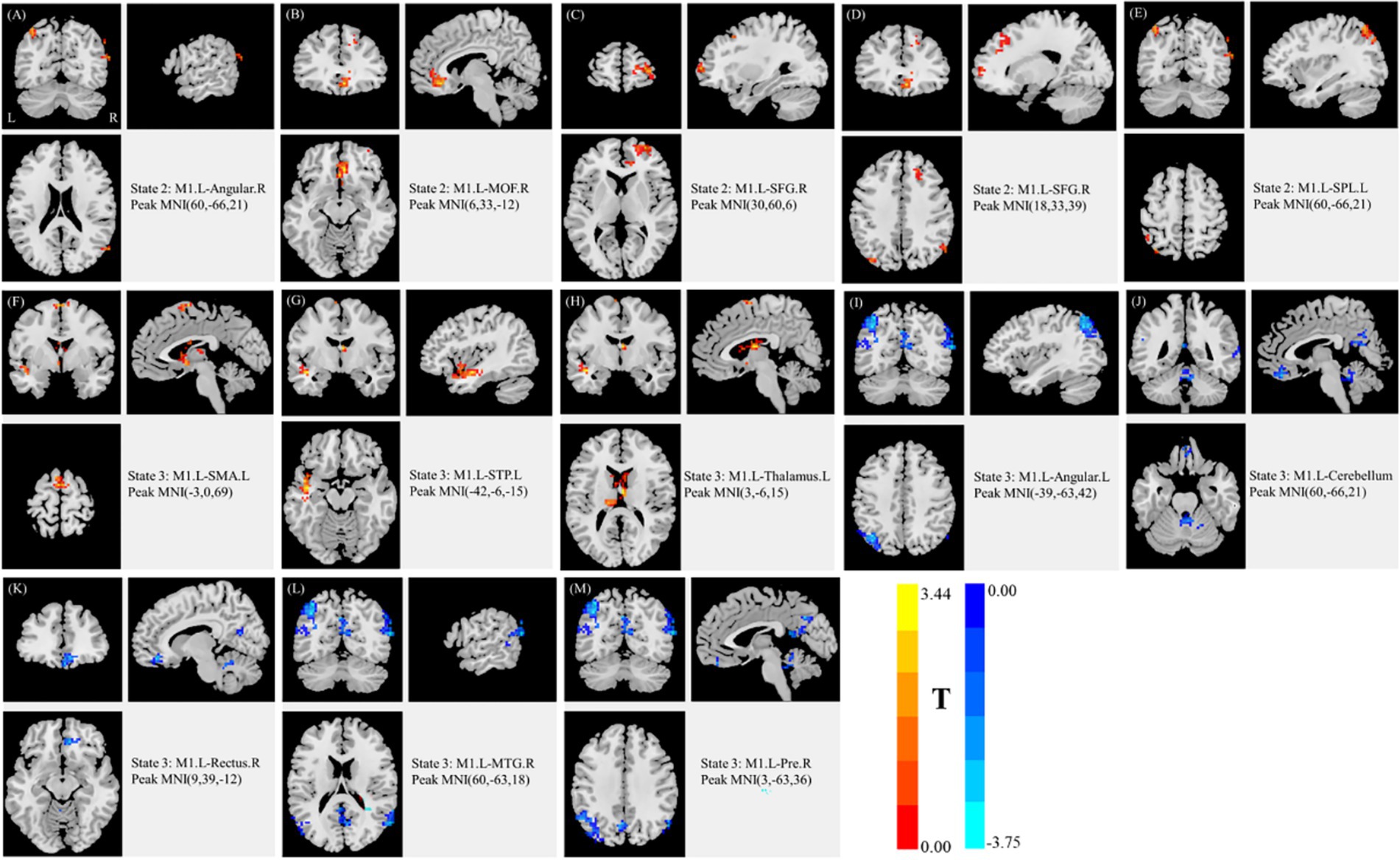 Figure 4. Discriminative features of selected states. (A–E) correspond to state 2, and (F–M) correspond to state 3, respectively. L, left; R, right; Angular, angular gyrus; MOF, medial orbitofrontal cortex; SFG, dorsolateral superior frontal gyrus; SPL, superior parietal lobule; SMA, supplementary motor area; STP, superior temporal pole; Thalamus, thalamus; cerebellum, cerebellum; Rectus, gyrus rectus; MTG, middle temporal gyrus; Pre, precuneus; MNI, Montreal Neurological Institute. Two-tailed two-sample t-test, p < 0.05 (|T| > 2.0), cluster size ≥ 50, uncorrected. Red indicates regions where functional connectivity was higher in MSP than in SSP; blue indicates the opposite (MSP, mild stroke patients; SSP, severe stroke patients).