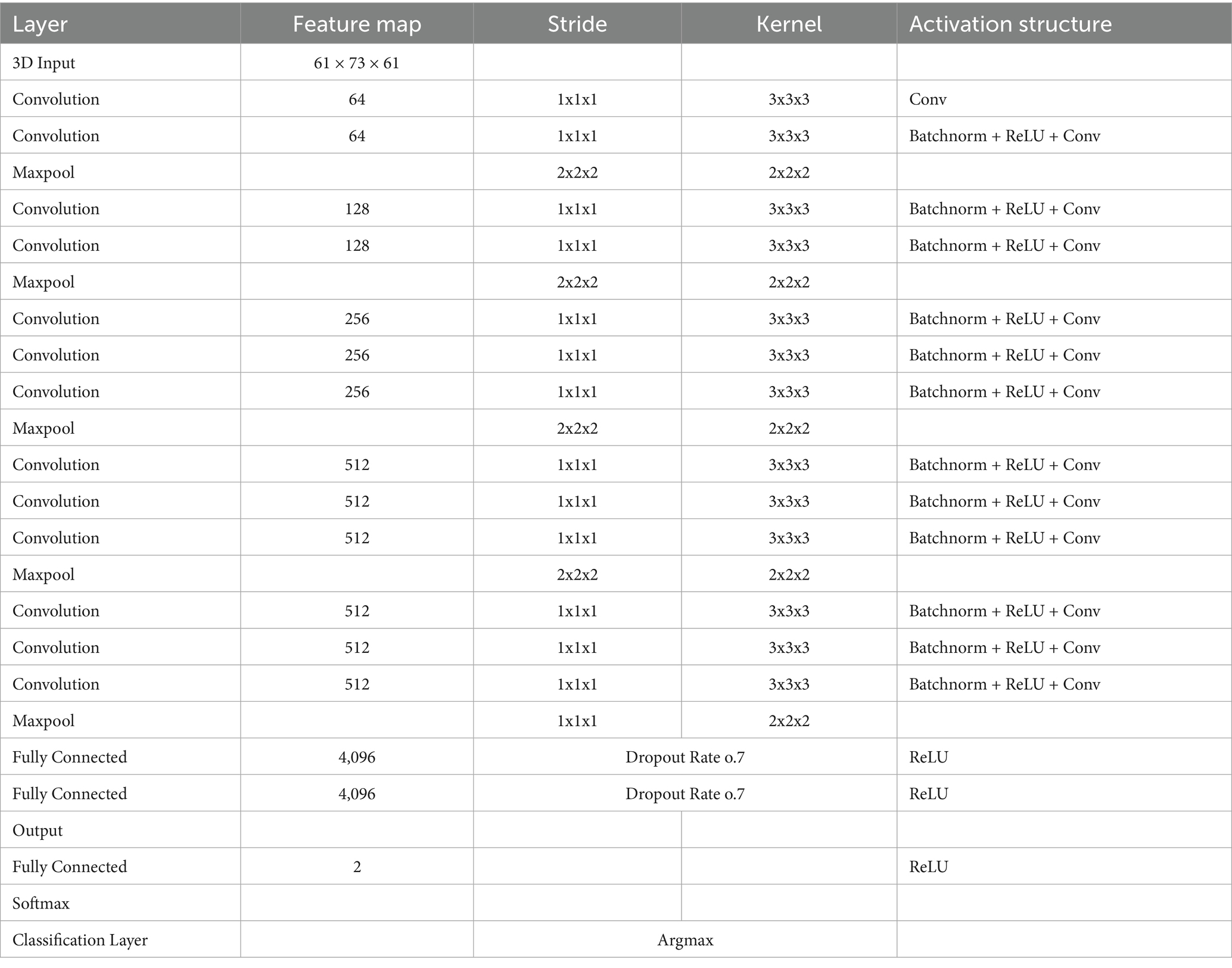 A 3D-CNN–based deep learning framework was developed for participant classification. The model was implemented in MATLAB 2019b with GPU acceleration on an NVIDIA Quadro RTX 5000. Training employed the Adam optimizer (41) with an initial learning rate of 0.001, which was reduced by half every 10 epochs. Each epoch consisted of 32-sample mini-batches over 50 epochs in total. An epsilon value of 0.001 was applied, and cross-entropy loss was used as the cost function. To mitigate overfitting, 10-fold cross-validation was performed to estimate mean classification accuracy at the dFC level. For each fold, 10% of the dFC maps were reserved for testing, while the remaining data were split into training (80%) and validation (10%) sets. The network was based on a modified VGG-Net architecture (42), incorporating batch normalization in convolutional layers and Rectified Linear Unit (ReLU) activation functions. A dropout rate of 0.7 was applied to the fully connected layers to enhance generalization. Weight initialization followed the method proposed by He et al. (43), using a zero-mean Gaussian distribution with a standard deviation scaled to network depth. Hyperparameters—including learning rate, epsilon, dropout rate, batch size, and number of epochs—were optimized based on prior work (24, 26). Specifically, epsilon was tuned in the range [0.1:0.05:1], learning rate across a logarithmic scale [1, 0.1, 0.01, 0.001, 0.0001, 0.00001], and dropout rate between [0.1:0.05:1]. Batch size was optimized using the maximum available GPU memory, while the number of epochs was tuned within [10:1:200]. The complete 3D-CNN architecture is shown in Figure 3 and detailed in Table 1.