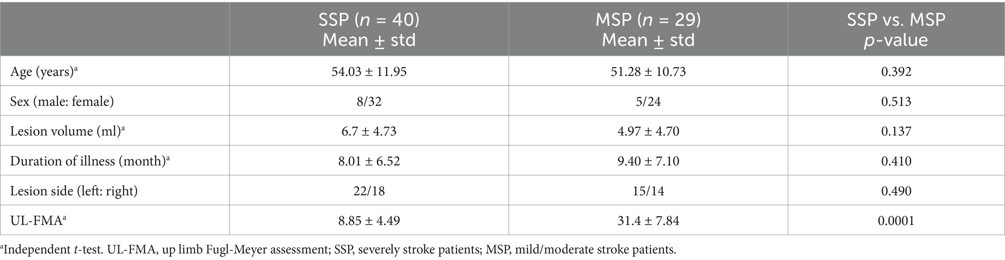 No significant differences were observed between the MSP and SSP groups in age (MSP: 54.3 ± 11.95 years; SSP: 51.28 ± 10.73 years; p = 0.392, two-sample t-test), sex distribution (MSP: 32 males; SSP: 24 males; p = 0.513, χ2 test), duration of illness (MSP: 8.01 ± 6.5 months; SSP: 9.40 ± 7.10 months; p = 0.410, two-sample t-test), or lesion volume (MSP: 6.7 ± 4.73 mL; SSP: 4.97 ± 4.70 mL; p = 0.513, two-sample t-test). As expected, UL-FMA scores were significantly different, with higher scores in the MSP group compared to the SSP group (31.4 ± 7.84 vs. 8.85 ± 4.49; p < 0.0001). Detailed demographic and clinical characteristics for all participants, including healthy controls (HCs), are presented in Table 2.