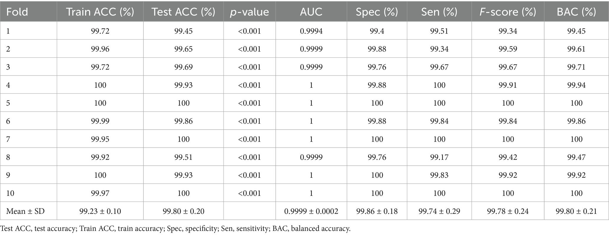 The 3D-CNN achieved high classification performance under 10-fold cross-validation. To mitigate potential bias from class imbalance, balanced accuracy was reported alongside other evaluation metrics. The mean performance across folds was as follows: training accuracy = 99.23%, test accuracy = 99.80%, specificity = 99.86%, sensitivity = 99.74%, F-score = 99.78%, and balanced accuracy = 99.80% (Table 3).