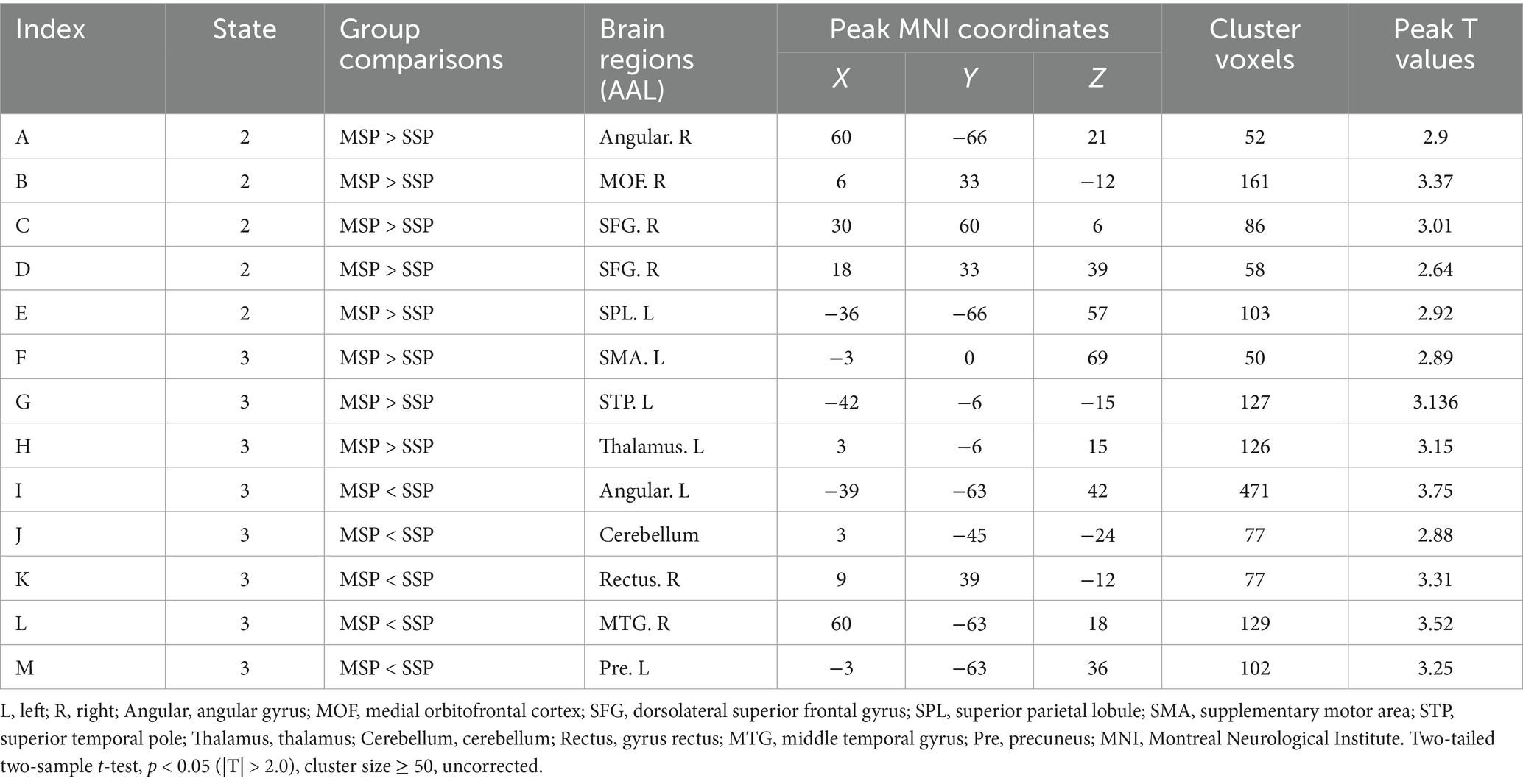 Discriminative brain regions contributing to the deep learning framework were identified using two-sample t-tests across dynamic states 2 and 3. Significant regions included the angular gyrus (Angular), MOF, SFG, SPL, SMA, superior temporal pole (STP), thalamus, cerebellum, gyrus rectus, middle temporal gyrus (MTG), and precuneus. Uncorrected t-values indicated group differences in functional connectivity: indices A-E corresponded to state 2 (t = 2.64–3.37), and indices F-M corresponded to state 3 (t = 2.88–3.75) (Table 4 and Figure 4). In Figure 4, red shading denotes regions where functional connectivity was higher in the MSP group compared to the SSP group, while blue shading indicates higher connectivity in SSP relative to MSP.
