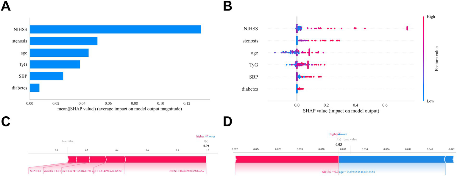 The overall incidence rate of END was 18.13%. The XGBoost model outperformed the other models, achieving a validation AUC of 0.874 (95% CI, 0.809–0.939), a sensitivity of 0.749, a specificity of 0.859, and excellent calibration (deviation: 0.116). DCA indicates the clinical utility of the XGBoost model. Key predictors included the NIHSS score (strongest driver), vascular stenosis severity, Triglyceride Glucose (TyG) index, age, initial systolic blood pressure (SBP), and diabetes. SHAP analysis provided interpretability for the machine learning model and revealed essential factors related to the risk of END in SICAS.