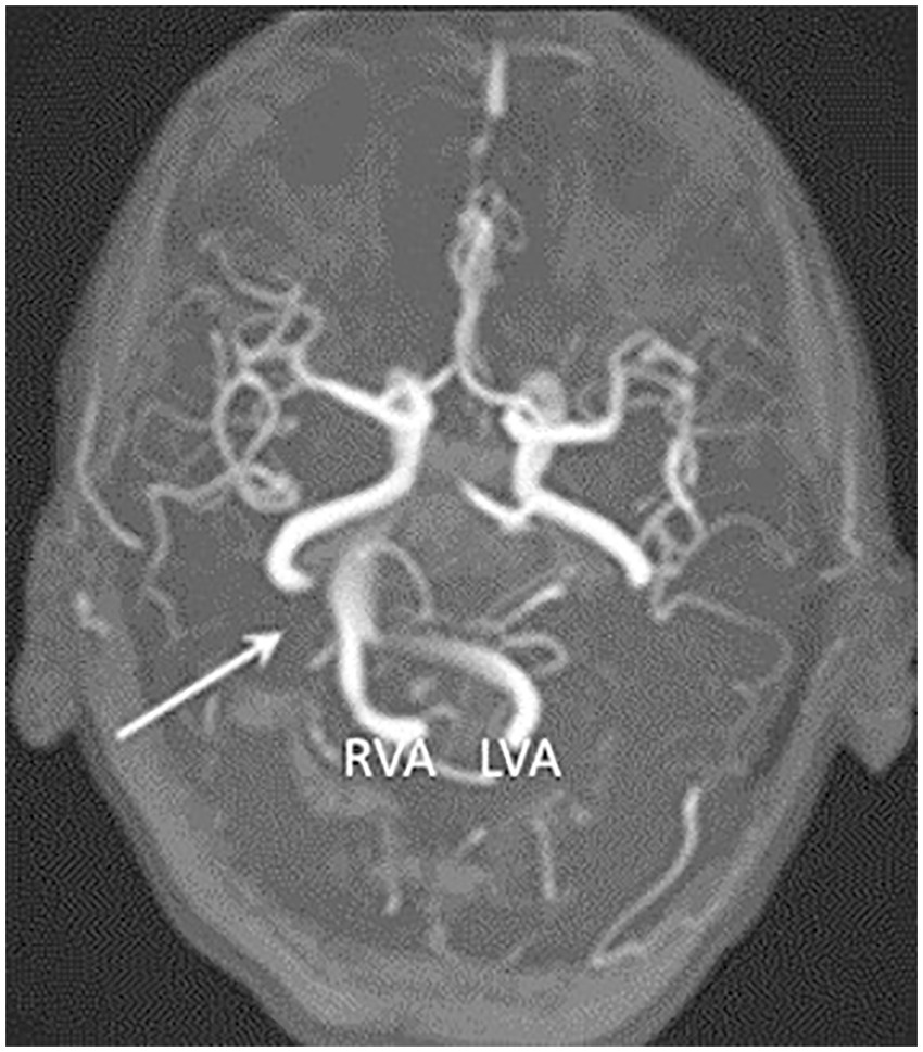 Figure 1. Case report of vertebrobasilar dolichoectasia published by Wang et al. (10), showing, by time-of-flight magnetic resonance angiography (TOF-MRA), a dilated and laterally displaced basilar artery (arrow) reaching the right cerebellopontine angle cistern. RVA: Right vertebral artery. LVA: Left vertebral artery. Image licensed under Creative Commons Attribution 4.0 International (CC BY 4.0), and modified for presentation in this article.