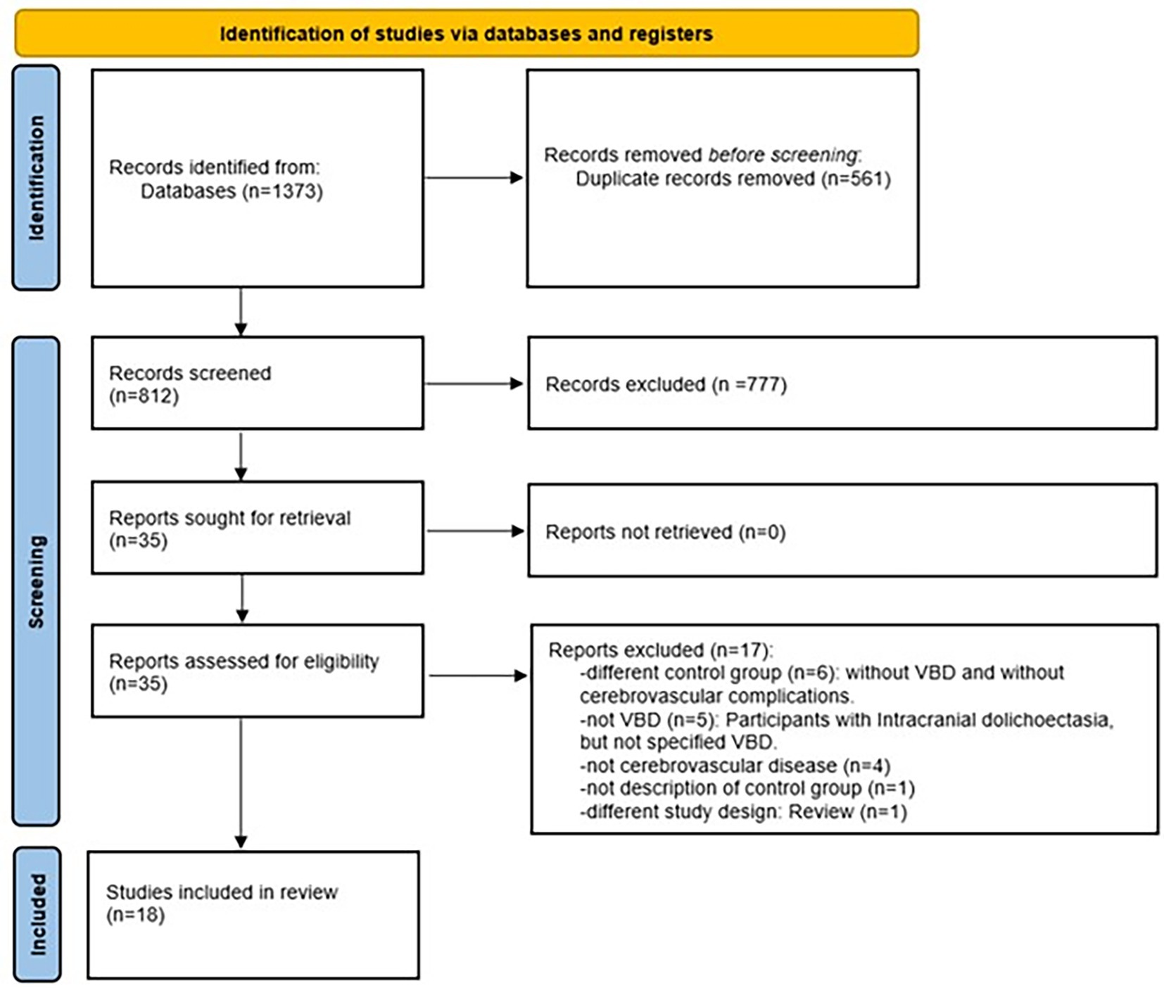 Results: Of 1,373 identified studies, 18 met the eligibility criteria, including 3,058 participants (1,055 cases and 2003 controls). Vertebrobasilar dolichoectasia components, independently or associated with cardiovascular risk factors such as hypertension, atherosclerosis, diabetes, or smoking, are associated with a higher risk of cerebrovascular disease, mainly in the posterior circulation, affecting brain regions as brainstem, cerebellum, thalamus and occipital cortex.