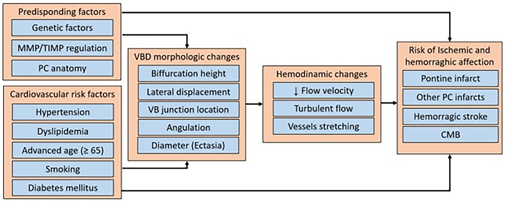 Figure 4. Summary diagram of the predisposing factors, cardiovascular risk factors, hemodynamic changes, and cerebrovascular diseases risk associated with vertebrobasilar dolichoectasia. MMP, matrix metalloproteinase, TIMP, tissue inhibitors of metalloproteinases; PC, posterior circulation; VBD, vertebrobasilar dolichoectasia; VB, vertebrobasilar; CMB, cerebral microbleeding.