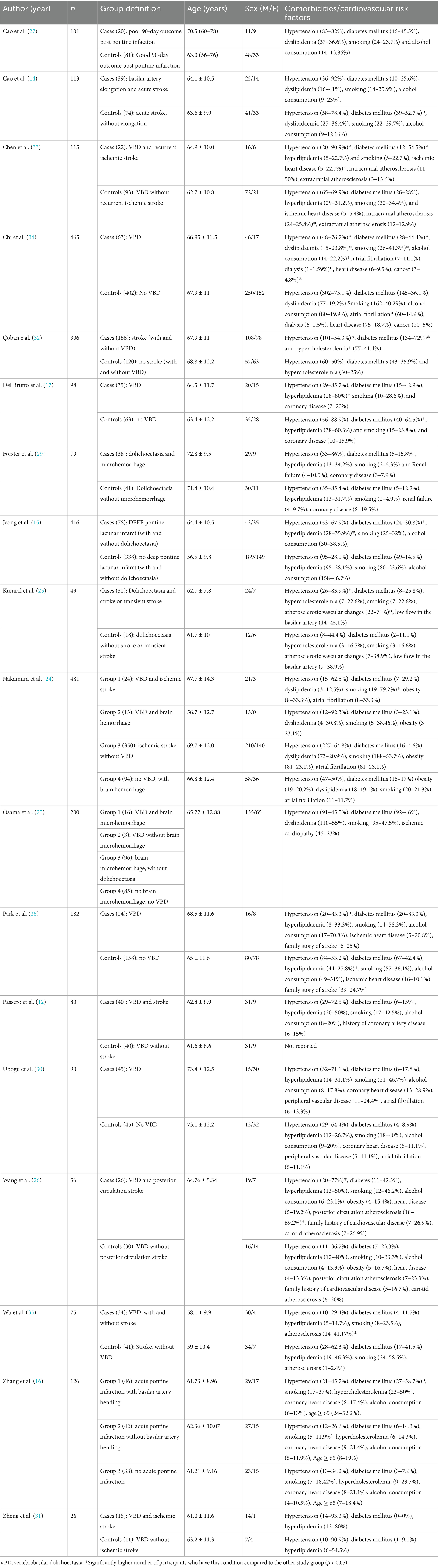 Among the included articles, 6 studies compared subjects with VBD and neurovascular complications with subjects with VBD without these complications (12, 15, 23, 26, 29, 32, 33). Between these two groups, the associated factors with the occurrence of cerebrovascular diseases were grouped into morphological characteristics of vertebrobasilar system, and cardiovascular risk factors. Regarding morphological characteristics of vertebrobasilar system, the results of the included studies show that arterial length (32), curve length and lateral displacement (16, 32), vertebrobasilar junction angle (15), bifurcation height (12, 26) were related to the occurrence of CVD. Basilar artery diameter (12, 31, 33), and vertebral artery hypoplasia (34) were also related to these complications. On the other side, the main reported risk factors associated with the occurrence of ischemic cerebrovascular complications in subjects with VBD were advanced age (14, 16), history of ischemic heart disease (33), hypertension (12, 15, 16, 27), diabetes mellitus (15, 16), smoking (16, 24), atherosclerosis (12, 16, 23, 26, 35), and history of hypercholesterolemia (16). Regarding intracerebral and subarachnoid hemorrhages, the identified risk factors were hypertension (24, 25), while for cerebral microhemorrhages, men were found to be more affected than women (29). Table 2 summarizes the main findings related to the risk factors indicated in each study and Table 1 of Supplementary material contains the morphological measurements of the included studies, with corresponding comparisons between cases and controls. Regarding this, all studies, 278 except 3 (25, 28, 35), reported these measurements, with their differences and significance.