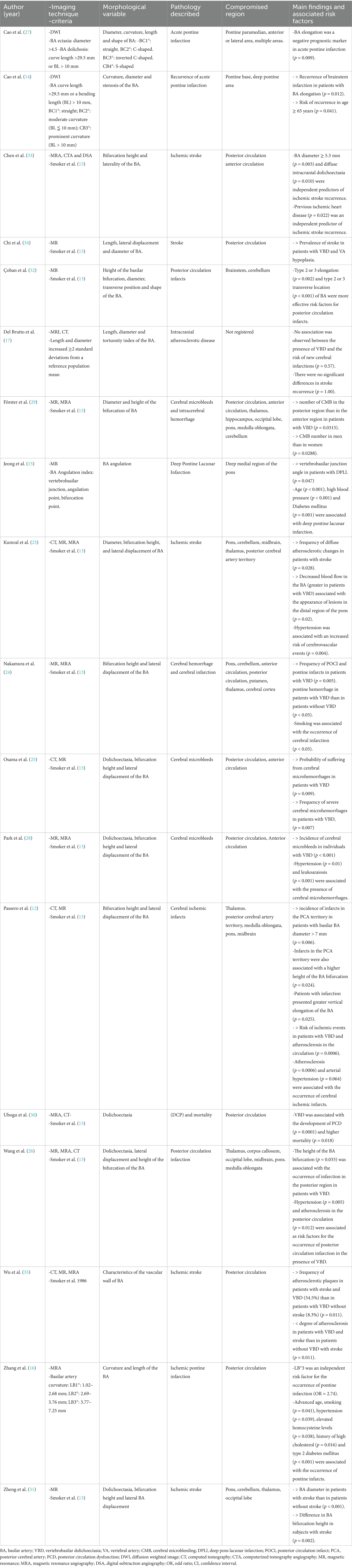 Regarding the detection method, the imaging techniques employed were magnetic resonance imaging techniques (MRI, HR-MRI, VWI MRI, ARMI) and computed tomography (conventional CT, angio-CT). Except for one study (17), all articles used manual methods for detecting VBD. Table 2 summarizes the findings related to morphological characteristics of the vertebrobasilar system measured in each study.