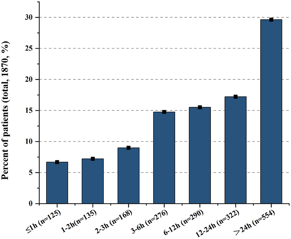 A total of 1,870 patients with acute ischemic stroke were recruited for this study, of whom the majority were male (61.7%) and aged ≥65 years (63.5%). Among all participants, 428 patients (22.9%) arrived at the hospital within 3 h of symptom onset, and 704 patients (37.6%) arrived within 6 h. Specifically, the proportions of patients with an ODT of 3–6 h, 6–12 h, 12–24 h, and >24 h were 14.8%, 15.5%, 17.2%, and 29.6%, respectively. Overall, 1,316 patients (70.4%) arrived within 24 h of symptom onset, whereas 554 patients (29.6%) presented after more than 24 h. The median ODT for the entire cohort was 11.0 h (interquartile range, 4.0–30.0 h; Figure 1).