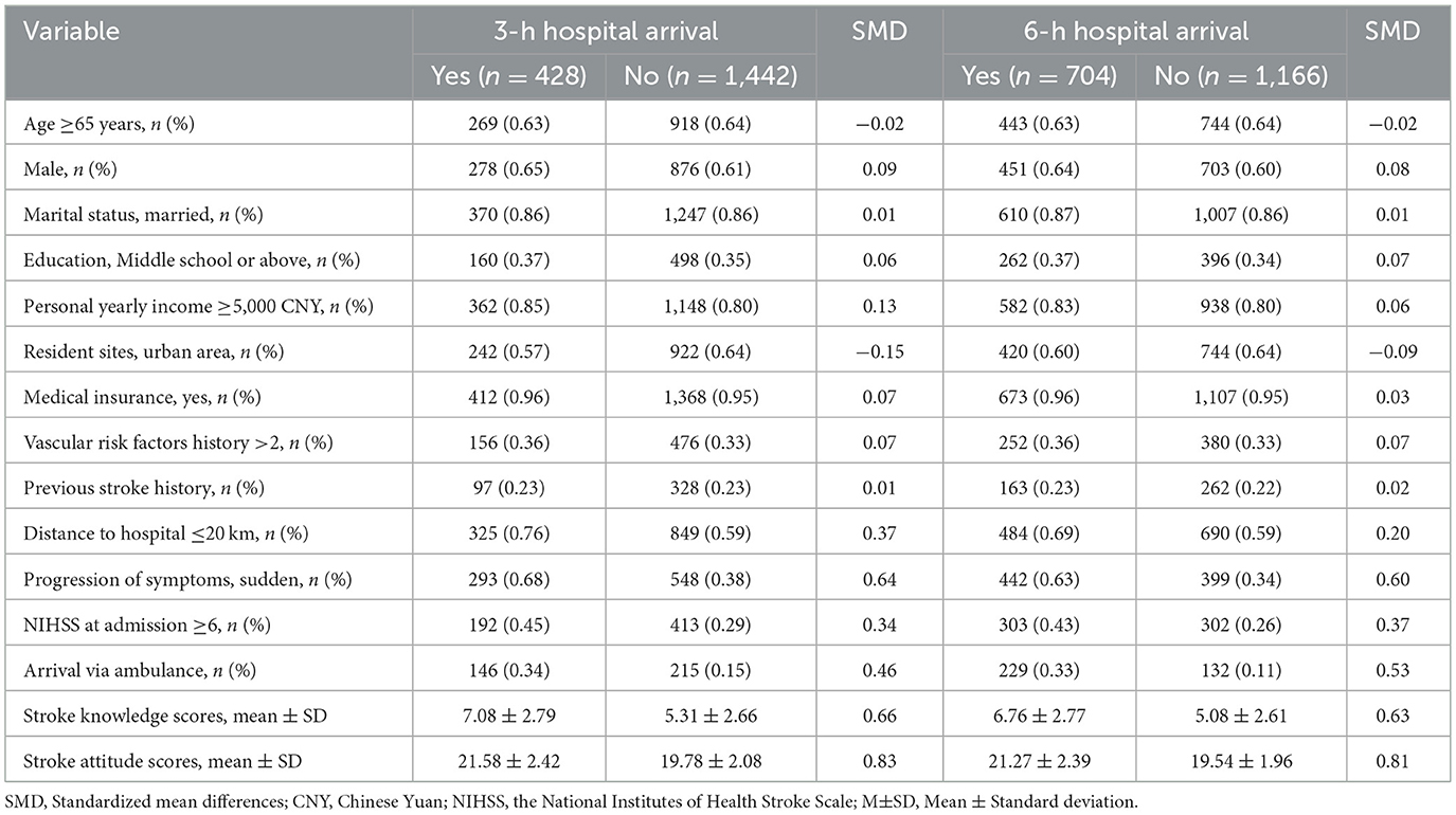 Similar trends were observed for the 6-h arrival threshold. Patients arriving within 6 h still showed higher stroke knowledge and attitude scores, were more likely to use ambulance transport, experience sudden symptom onset, and have stroke onset at locations closer to the hospital. In contrast, other sociodemographic and clinical characteristics—including age, sex, marital status, education level, personal yearly income, medical insurance coverage, previous stroke history, and vascular risk factors history—showed minimal differences between early and late arrivers, with all standardized mean differences (|SMD|) <0.1.