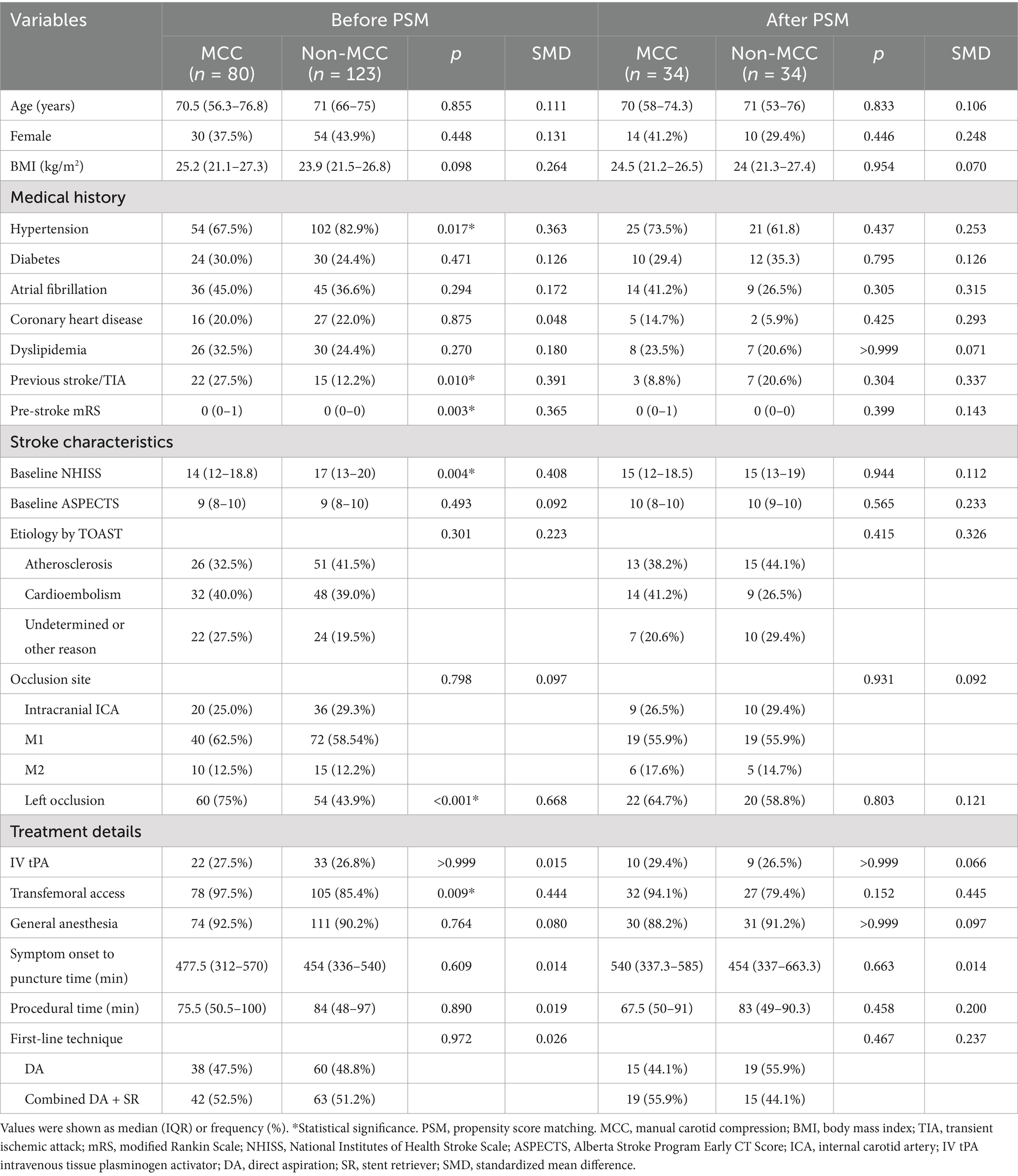 Between November 2024 and March 2025, 239 AIS patients receiving MCC in EVT were assessed for eligibility, of whom 36 were excluded, and 203 were ultimately included (n = 80 in the MCC group and n = 123 in the non-MCC group) (Figure 1). In the overall cohort, the median age was 71 years (IQR 62–76), with 119 male patients (58.6%). The median baseline NHISS score was 15 (IQR 12–20), and the median baseline ASPECTS was 9 (IQR 8–10). The median time from symptom onset to puncture was 469 min (IQR 330–570). A total of 55patients (27.1%) received IV tPA prior to EVT. The occlusion sites were intracranial ICA [56 (27.6%)], M1 [122 (60.1%)], and M2 [25 (12.3%)]. According to the TOAST classification, 77 patients (37.9%) were identified as having atherosclerosis-related LVO, and 80 patients (39.4%) were judged to have cardiogenic embolism.