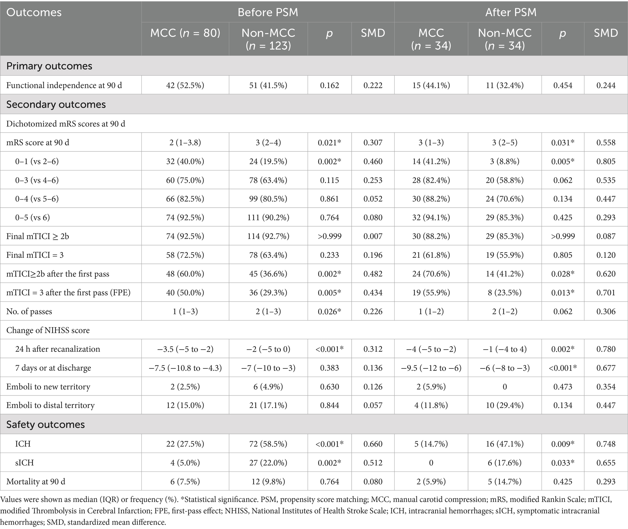 Regarding safety outcomes, the MCC group showed a significant reduction in the incidence of ICH and sICH before and after PSM analysis. Enhanced first-pass reperfusion efficiency minimized mechanical damage to the blood–brain barrier at the occlusion site and ischemic time. Additionally, in AIS patients with high blood pressure and significant blood pressure variability, the risk of ICH after EVT is increased (33, 34). Early control of hemodynamic impact after reperfusion can mitigate reperfusion injury and promote recovery of the ischemic penumbra tissue (35). Similarly, the study by Deng et al. (36) on rapid local ischemic postconditioning, which reduced reperfusion injury and promoted functional independence, is also based on this theory. During thrombectomy, MCC has the value of reducing transient blood flow impact upon reperfusion, thereby providing neuroprotection. Therefore, theoretically, regular MCC after reperfusion may also hold potential neuroprotective applications for ischemic postconditioning. Xu et al. (37) also highlighted the role of non-pharmacological therapies in improving the imbalance caused by hyperperfusion during the reperfusion phase. Our study considered MCC as an efficient and effective non-pharmacological approach. Therefore, our research suggested that MCC warrants further large-scale and in-depth studies to confirm its value in preventing hemorrhagic transformation associated with endovascular treatments.