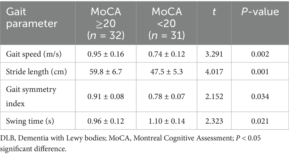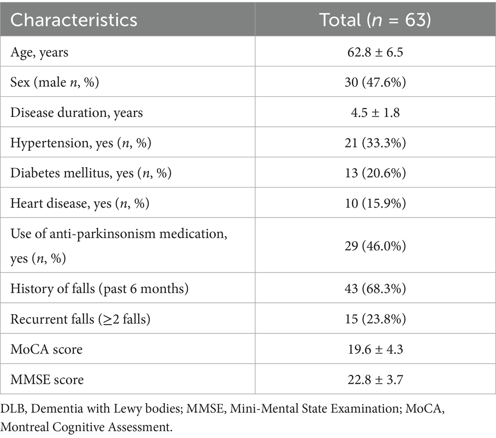 This cross-sectional observational study enrolled 63 patients diagnosed with DLB at the Department of Neurology outpatient and inpatient units of our hospital between January 2020 and June 2024. The mean age of the patients was 62.8 ± 6.5 years. Among the patients, 30 (47.6%) were male. Cognitive function was assessed using the Montreal Cognitive Assessment (MoCA, mean score 19.6 ± 4.3) and Mini-Mental State Examination (MMSE, mean score 22.8 ± 3.7). Demographic and clinical characteristics of the patients are summarized in Table 1. DLB patients were diagnosed according to the fourth criteria for the diagnosis and management of dementia with Lewy bodies (2). These patients were initially present with at least two core clinical features of DLB (fluctuating cognition, visual hallucinations, parkinsonism, and/or rapid eye movement sleep behavior disorder) or one core clinical feature with at least one indicative biomarker including reduced dopamine transporter uptake in the basal ganglia demonstrated by single-photon emission computed tomography (SPECT) or positron emission tomography-computed tomography (PET), abnormal (low uptake) 123-Iodine-MIBG myocardial scintigraphy, and RBD screening questionnaire (RBD-SQ) and/or polysomnographic confirmation of RBD. The enrolled patients showed relative preservation of medial temporal lobe structures on MRI and/or CT. All clinical diagnoses of dementia were confirmed by consensus agreement of at least two experienced neurologists, following a case review according to the protocol. Patients meeting any of the following exclusion criteria were excluded from this study: (1) patients with other severe neurodegenerative disorders, such as Alzheimer’s disease, Parkinson’s disease, or Huntington’s disease; (2) patients with severe motor impairment precluding independent walking or participation in gait analysis; (3) patients with a history of stroke, major surgery, or other serious illness significantly affecting gait within the past 6 months; (4) patients with profound cognitive impairment rendering them unable to cooperate with cognitive testing; (5) patients or their legal representatives refusing to participate or withdrawing informed consent. This study was approved by the Medical Ethics Committee of our hospital (Approval No.: [EC-024-523]). Informed consent was obtained from all participants or their legal guardians in accordance with the ethical principles of the Helsinki Declaration.