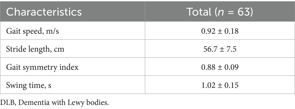 Gait parameters were analyzed for 63 DLB patients. Mean gait parameters were as follows: gait speed, 0.92 ± 0.18 m/s; stride length, 56.7 ± 7.5 cm; gait symmetry index, 0.88 ± 0.09; and swing time, 1.02 ± 0.15 s. Detailed gait characteristics of the patients are presented in Table 2.