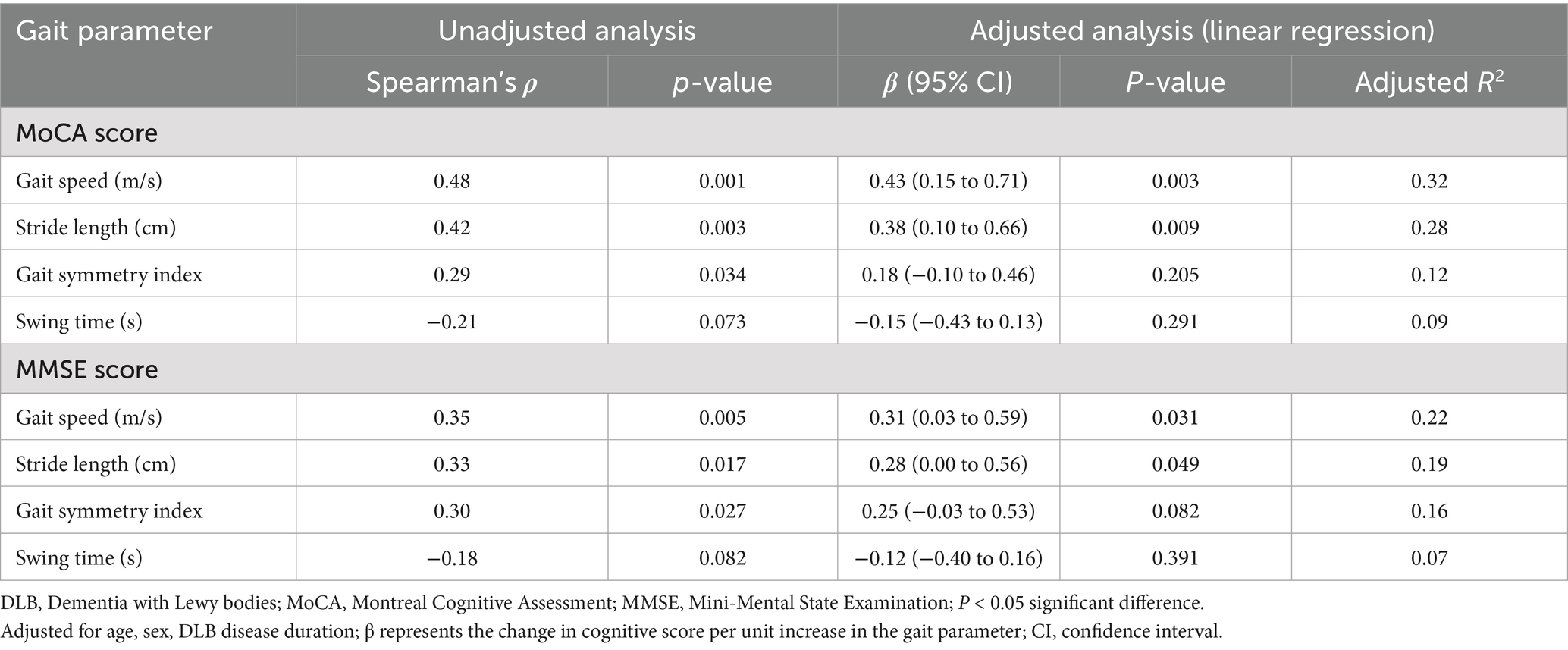The associations between gait parameters and cognitive function (MoCA/MMSE scores) were first explored using unadjusted Spearman rank correlation analysis. To control for potential confounders and to ensure methodological consistency with the fall risk analysis, these associations were further assessed using multiple linear regression models, adjusting for the same covariates employed in the logistic regression models (i.e., age, sex, DLB disease duration). The variance inflation factor (VIF) was examined for all models to confirm the absence of multicollinearity (all VIF < 2.0).