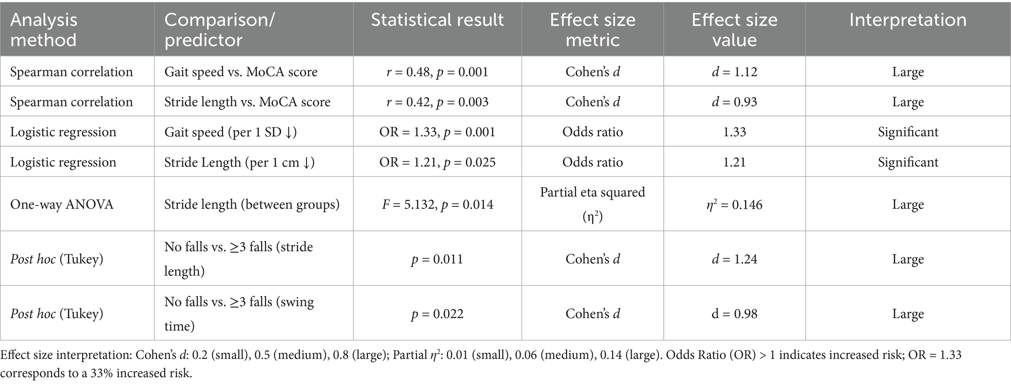 As shown in Table 7, the correlation between gait speed and MoCA score was strong (Cohen’s d = 1.12). One-way ANOVA comparing gait parameters across fall-frequency groups (no falls, 1–2 falls, ≥3 falls) revealed significant differences in stride length (F = 5.132, p = 0.014, partial η2 = 0.146), indicating a large effect size. Post hoc Tukey’s HSD tests showed that patients with recurrent falls (≥3) had a 13% reduction in stride length compared to the no-fall group (p = 0.011, Cohen’s d = 1.24) and a 12% prolongation in swing time (p = 0.022, Cohen’s d = 0.98). Multivariable logistic regression identified gait speed (OR = 1.33 per 1-SD decrease, p = 0.001) and stride length (OR = 1.21 per 1-cm decrease, p = 0.025) as significant predictors of fall risk.