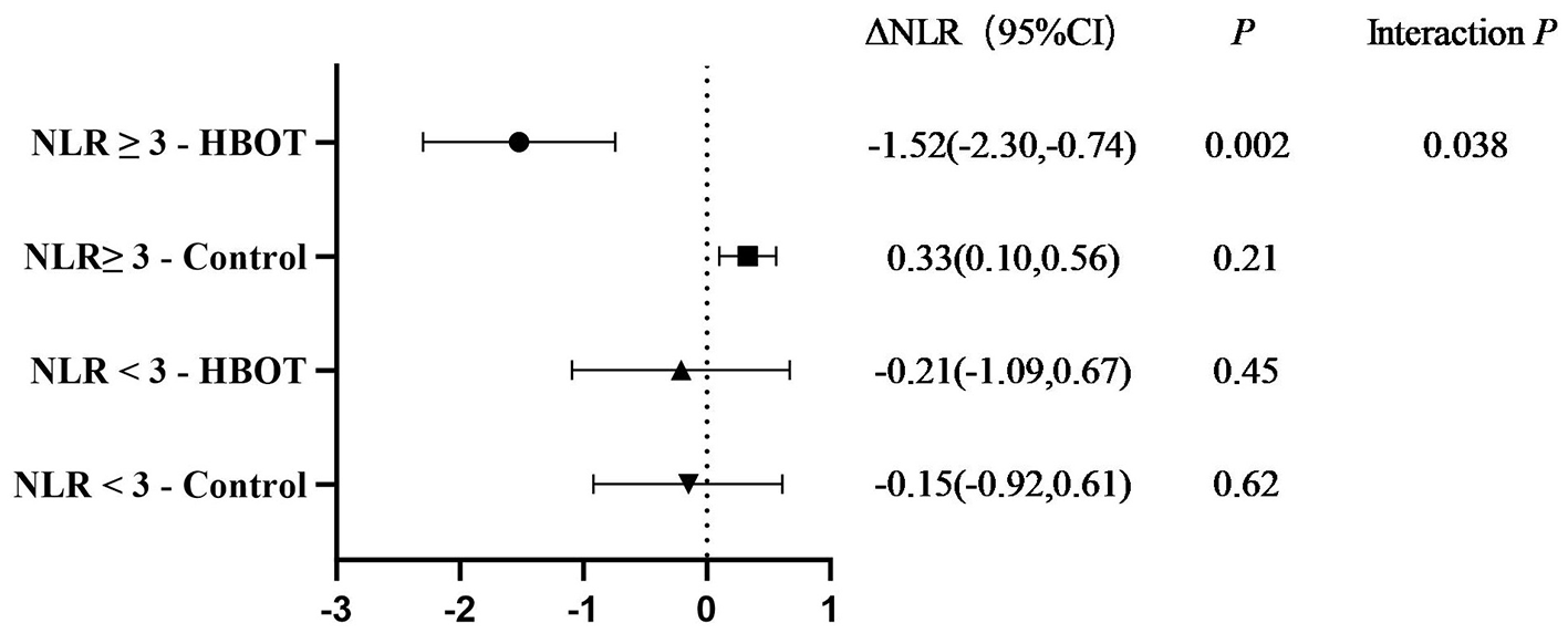 After a median of 12 HBOT sessions, the HBOT group showed a 31.78% increase in lymphocyte count (Δ = +0.41 × 109/L, 95% CI: 0.05–0.77), and significant reductions in NLR by 18.98% (Δ = −0.52, 95% CI: −1.02 to −0.02) and PLR by 17.97% (Δ = −37.21, 95% CI: −69.15 to −5.27). After adjustment, the HBOT group demonstrated significantly greater improvements in NLR (−55.56%) and PLR (−22.79%) compared to the control group (both Bonferroni-corrected P < 0.01). Subgroup analysis revealed that patients with baseline NLR ≥ 3 benefited the most (interaction P = 0.038). No serious adverse events were observed.