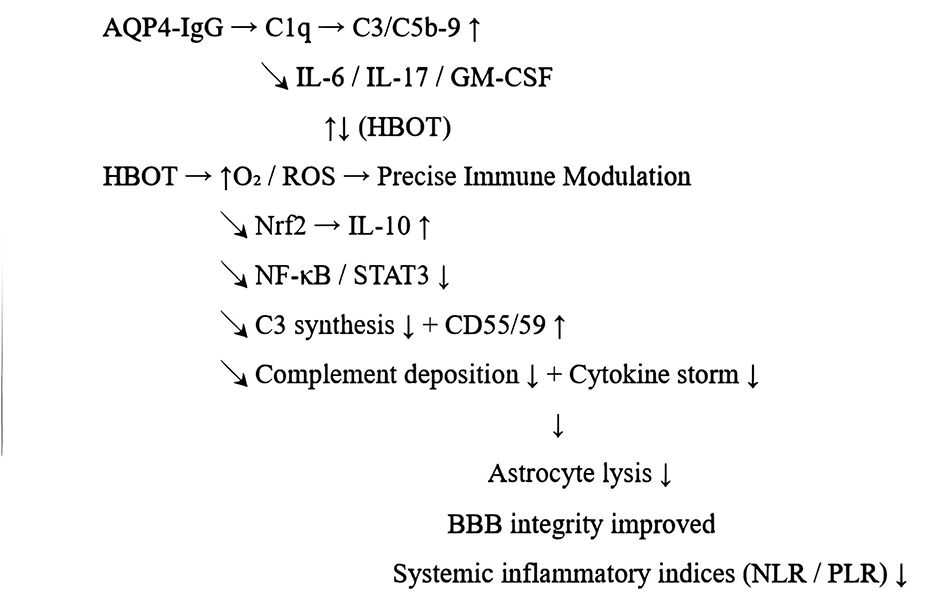 Hyperbaric Oxygen Therapy (HBOT) refers to the medical treatment of inhaling 100% oxygen at pressures higher than normal atmospheric pressure (usually 1.5–2.5 ATA) to increase blood oxygen partial pressure, improve tissue oxygenation, and induce a series of cellular protective pathways (7–9). Animal and clinical studies have shown that HBOT can achieve multiple effects, including anti-inflammatory, neuroprotective, and promoting injury repair, by inhibiting reactive oxygen species production, regulating the balance of pro-inflammatory/anti-inflammatory cytokines, suppressing neutrophil extracellular trap (NETs) formation, and improving mitochondrial function (10–13). Furthermore, recent animal and clinical studies have found that HBOT provides new biological evidence for its application in neuroimmune diseases through (1) inhibiting NETs-mediated complement activation, (2) down-regulating Th17/GM-CSF while promoting Treg formation, (3) inducing microglial M1 → M2 polarization, (4) suppressing the NLRP3-pyroptosis pathway, (5) protecting the blood-brain barrier, (6) activating the Nrf2/HO-1 antioxidant axis, (7) closing the NF-κB-chemokine “master switch”, and (8) promoting neurovascular remodeling through multi-target synergy (13–19). In neuro-immune related diseases such as multiple sclerosis, spinal cord injury, and chronic wounds, HBOT has shown potential in reducing neuroinflammation and improving functional outcomes (20, 21). However, its impact on inflammatory response and immune balance in NMOSD patients remains lacking in systematic research.