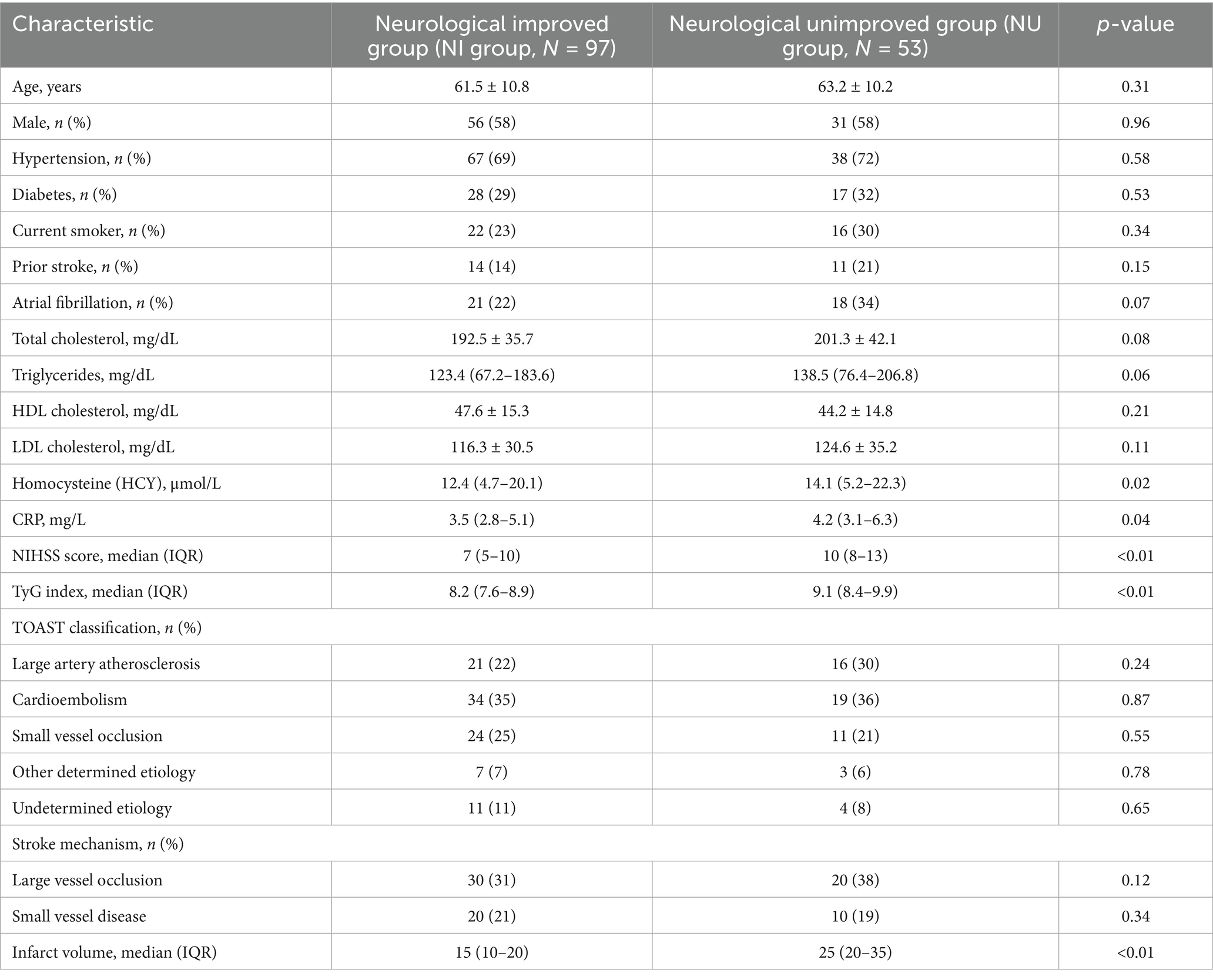 The NI group (N = 97) and NU group (N = 53) did not show a statistically significant difference in age, gender, prevalence of hypertension, and diabetes (p > 0.05 for all). However, the NU group exhibited a higher proportion of patients with atrial fibrillation (34% vs. 22%, p = 0.07) and higher levels of homocysteine (HCY) (14.1 μmol/L vs. 12.4 μmol/L, p = 0.02) and CRP (4.2 mg/L vs. 3.5 mg/L, p = 0.04). NIHSS scores and TyG index were significantly higher in the NU group (p < 0.01 for both), indicating greater stroke severity and metabolic dysregulation in non-improved patients.