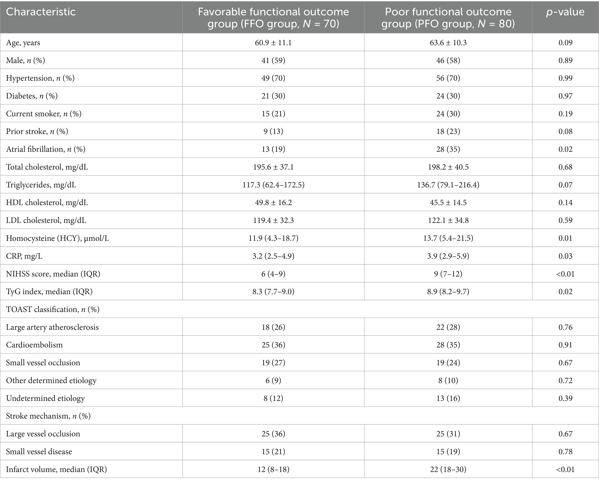 The FFO group (N = 70) and PFO group (N = 80) did not differ significantly in age, gender, hypertension, diabetes, and smoking status (p > 0.05 for all). Atrial fibrillation was more prevalent in the PFO group (35% vs. 19%, p = 0.02). Elevated HCY (13.7 μmol/L vs. 11.9 μmol/L, p = 0.01) and CRP levels (3.9 mg/L vs. 3.2 mg/L, p = 0.03) were also associated with poor functional outcomes. Consistent with the neurological outcome group, higher NIHSS scores and TyG index were observed in the PFO group (p < 0.01 for both).