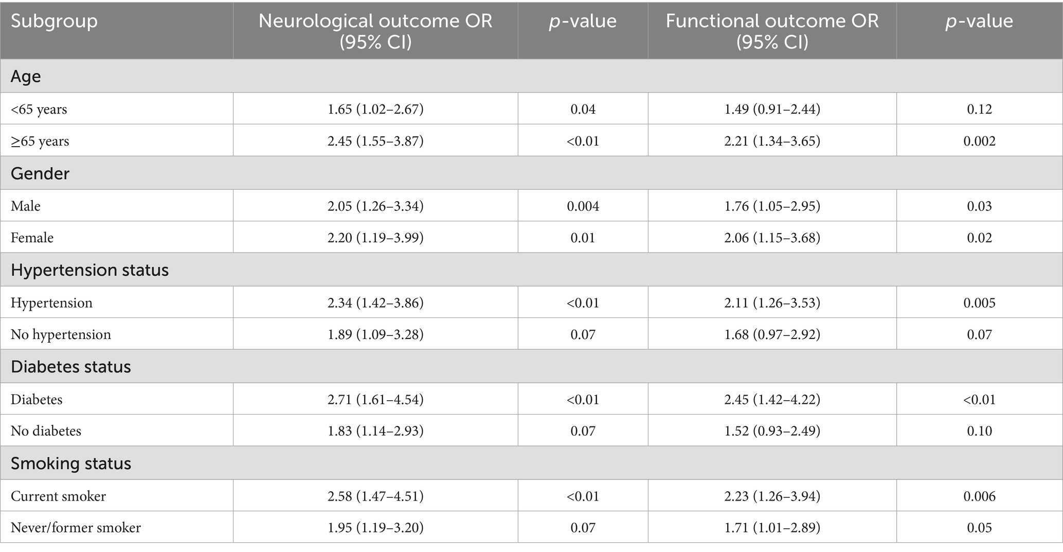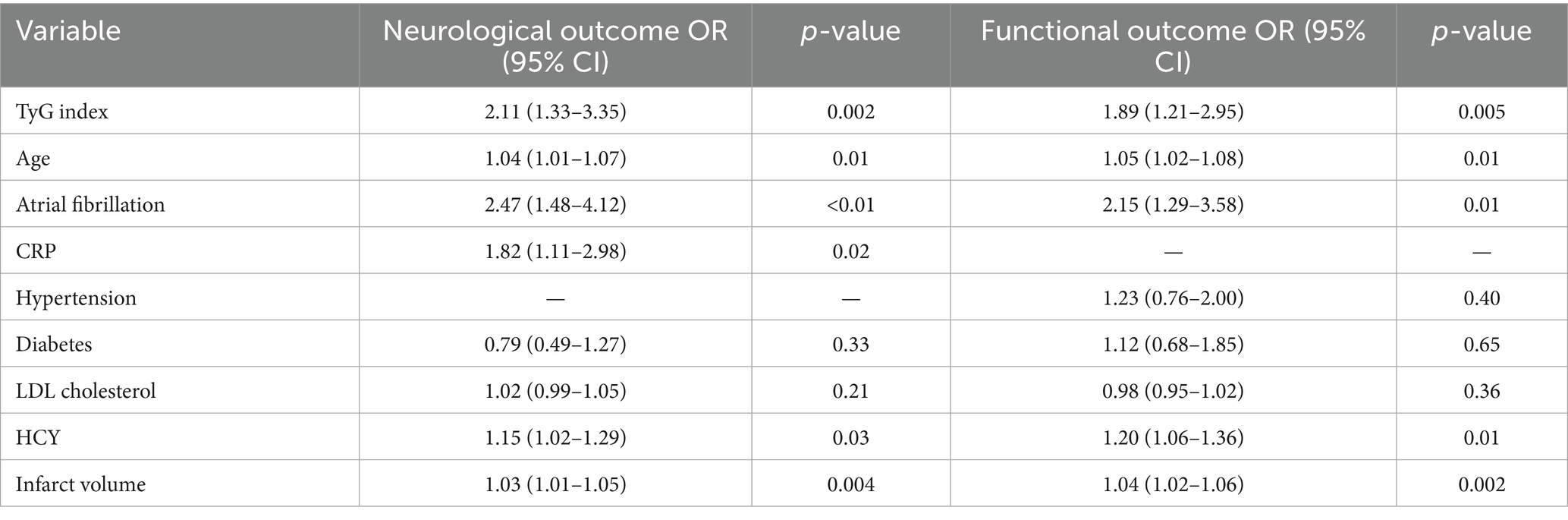 The study compared the TyG index in patients with favorable and unfavorable outcomes using Student’s t-test or Mann–Whitney U-test for continuous variables, and chi-square test for categorical variables. The correlation between the TyG index and outcomes was assessed using Spearman’s rank correlation coefficient. Multiple logistic regression analysis was performed to adjust for potential confounders including age, hypertension, and diabetes, current smoking, prior stroke, atrial fibrillation, total cholesterol, triglycerides, HDL cholesterol, LDL cholesterol, homocysteine (HCY) and C-reactive protein (CRP). Subgroup analyses were conducted to investigate the relationship between the TyG index and short-term neurological and functional outcomes in specific subsets.
