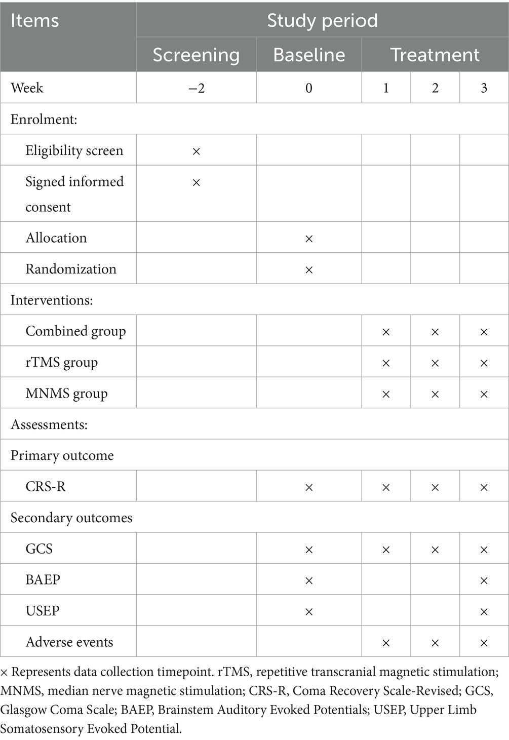 The complete assessment schedule is presented in Table 1. Participants will be evaluated at screening (Week 2), baseline (Week 0), and during treatment (Weeks 1, 2, and 3). Demographic characteristics and medical history will be collected only at the first visit. Baseline assessments—including CRS-R, GCS, BAEP, and USEP—will be completed at Week 0, after which randomization and treatment initiation will occur. The primary outcome (CRS-R) will be assessed at every scheduled visit from baseline onward. Secondary outcomes will be measured at designated time points. All evaluations will be conducted in the rehabilitation assessment suite.