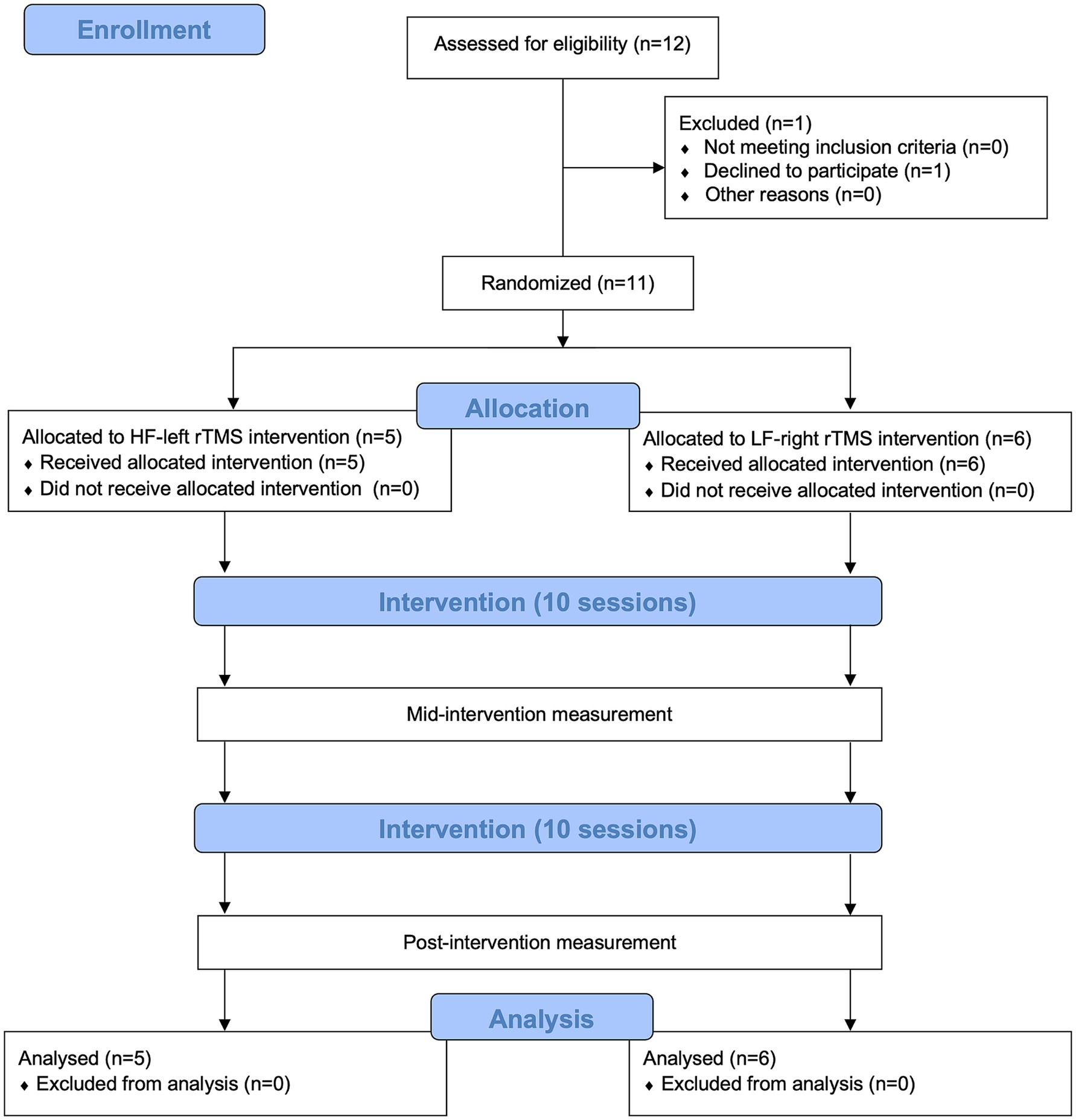 This study was designed as a double-blind, randomized controlled trial. Participants were randomly allocated to either the high-frequency rTMS group targeting the left DLPFC (HF-left) or the low-frequency rTMS group targeting the right DLPFC (LF-right). The allocation sequence was generated using a random number generator by an independent assessor uninvolved in stimulation or analysis. Participants, outcome assessors and data analyzers were kept unaware of the group allocation. Baseline evaluations encompassed demographic data, clinical features, HAMD scores, MMSE scores, National Institutes of Health Stroke Scale (NIHSS) scores, and resting-state EEG (rsEEG) measurements (labeled as timepoint 0, T0). Subsequently, the participants completed 20 daily sessions of rTMS (5 days a week, over a 4-week period). HAMD scores and rsEEG assessments were repeated upon completion of 10 and 20 rTMS sessions, denoted as timepoints 1 (T1, mid-treatment, after 10 sessions) and 2 (T2, post-treatment, after 20 sessions), respectively.