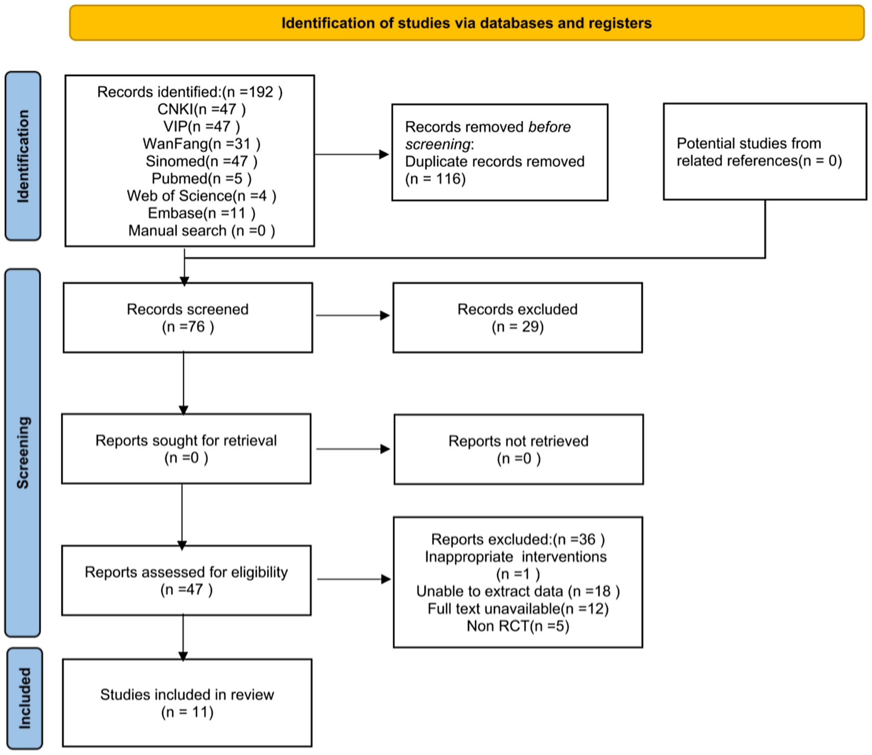 The initial search identified 192 potentially relevant records, with 116 duplicates removed. Following title and abstract screening, 29 studies were excluded per eligibility criteria, leaving 47 for full-text assessment. After full-text review, 36 studies were excluded due to: intervention mismatch (n = 1), irretrievable data (n = 18), unavailable full texts (n = 12), or non-RCT designs (n = 5). Consequently, 11 studies (17–27) were included in the meta-analysis, with the selection process detailed in Figure 1.