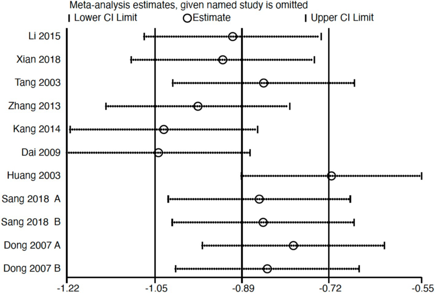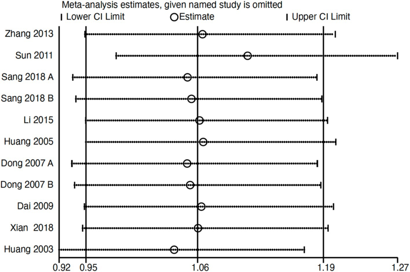 Sensitivity analyses were performed by sequentially excluding studies with high risk of selection bias and those whose confidence intervals (CIs) did not overlap with the pooled effect estimate’s CI.