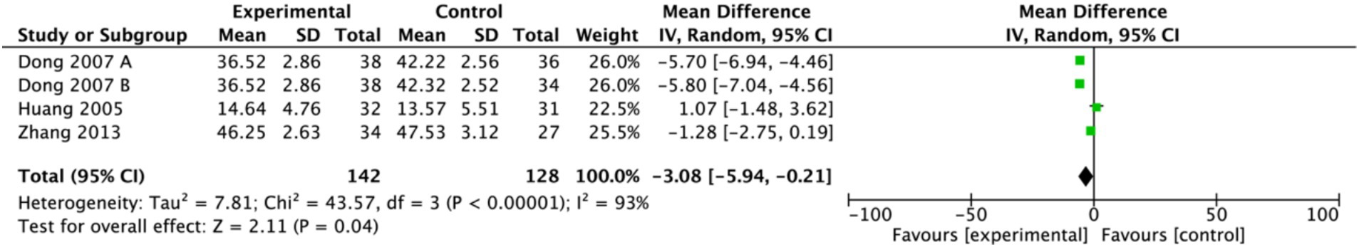 ![Forest plot showing mean differences between experimental and control groups for four studies: Dong 2007 A and B, Huang 2005, Zhang 2013. Each study's data includes means, standard deviations, sample sizes, and weights. Combined mean difference is -3.08 with a 95% confidence interval [-5.94, -0.21]. Heterogeneity is high with I² = 93%. Plot favors the experimental group.](https://www.frontiersin.org/files/Articles/1671808/fneur-16-1671808-HTML-r1/image_m/fneur-16-1671808-g015.jpg)