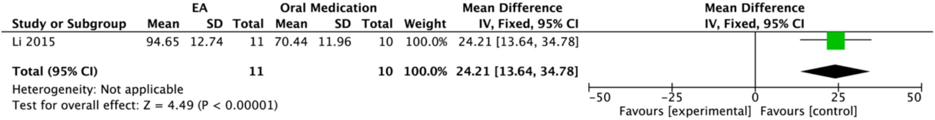 ![Forest plot showing a comparison of EA and oral medication in Li 2015 study. EA group: mean 94.65, SD 12.74; Oral Medication group: mean 70.44, SD 11.96. Mean difference: 24.21 [95% CI: 13.64, 34.78]. Overall effect: Z = 4.49, p < 0.00001, indicating a significant result.](https://www.frontiersin.org/files/Articles/1671808/fneur-16-1671808-HTML-r1/image_m/fneur-16-1671808-g018.jpg)