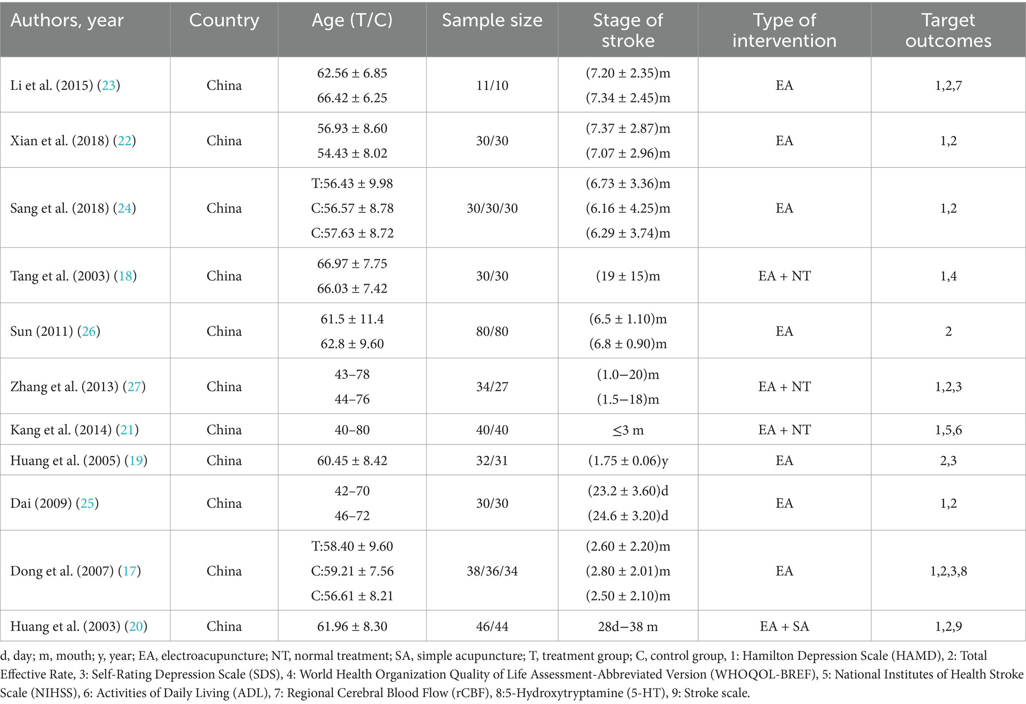 Table 1 summarizes study characteristics. Notably, all 11 included studies were conducted in China, totaling 853 participants. Participant ages ranged from 40 to 80 years, sample sizes varied from 21 to 160, and stroke chronicity spanned 28 days to 3 years post-stroke. Three studies compared EA versus oral medication (19, 23, 25), while two examined EA plus normal treatment (NT) versus medication plus NT (21 27). One study assessed EA against simple acupuncture only (22) and another evaluated EA combined with simple acupuncture versus simple acupuncture alone (20). Additional designs included EA plus scalp acupuncture versus oral medication (26).