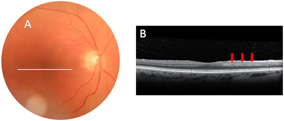 Figure 1. Demonstration of paracentral acute middle maculopathy on ocular imaging obtained four days after transient monocular vision loss in the right eye. (A) Color fundus photograph of the right eye is normal. White line corresponds to the scan area of the SD-OCT. (B) SD-OCT of the macula shows hyperreflective focal lesions at the level of the inner nuclear layer (red arrows), consistent with ischemia of the deeper vascular complex of the inner retina as seen with PAMM.