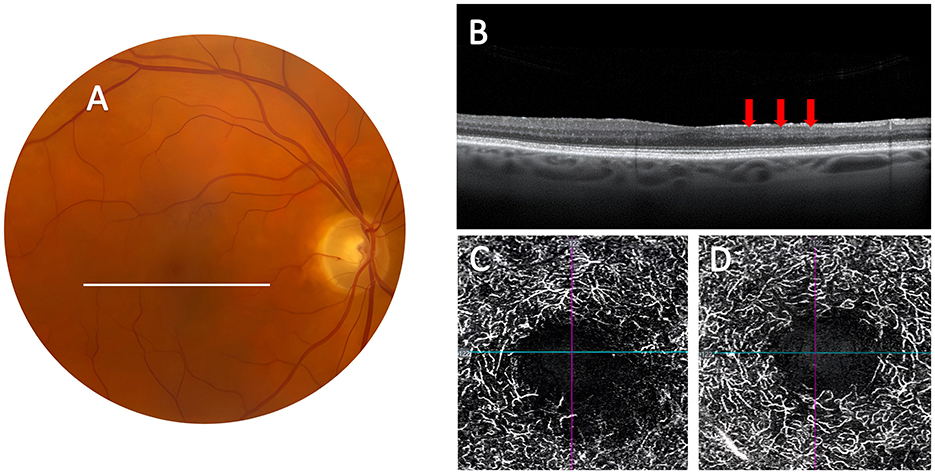 Figure 2. Evolution of paracentral acute middle maculopathy on ocular imaging obtained 36 weeks after presentation. (A) Color fundus photograph of the right eye remained normal. (B) SD-OCT of the macula shows evolution of the lesion with thinning at the level of the inner nuclear layer (red arrows). (C) OCT-A of the DCP with attenuation of the capillaries in the inferonasal parafoveal area the right eye. (D) OCT-A with normal parafoveal capillaries of the DCP in the left eye.
