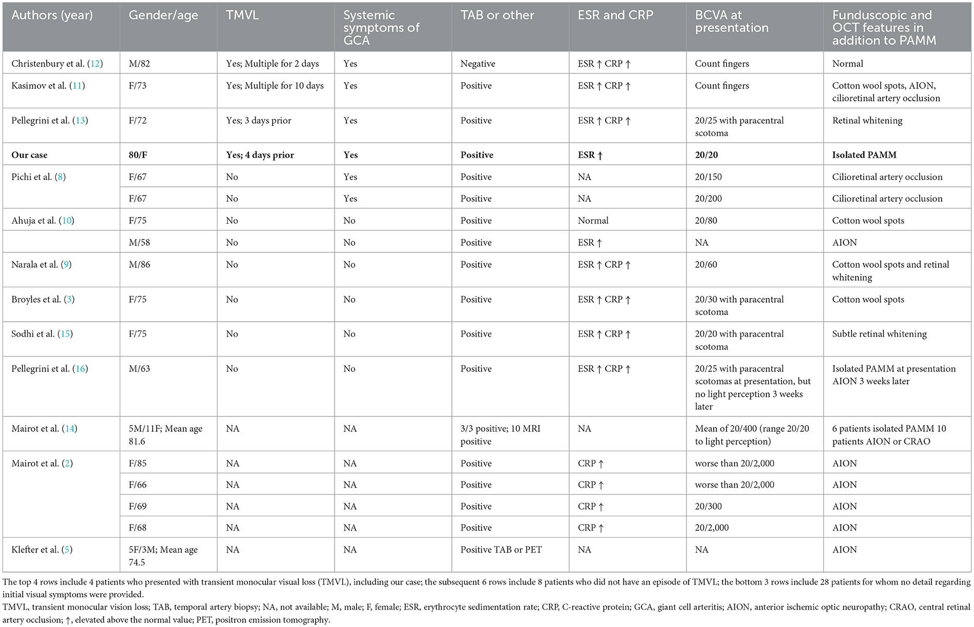 Table 1. Summary of the reports of paracentral acute middle maculopathy in giant cell arteritis identified in the English literature.