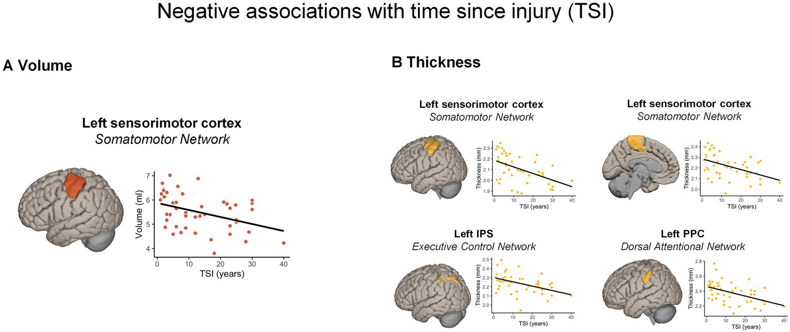 Significant morphometric changes negatively associated with time since injury. A longer TSI was associated with (A) a greater volume reduction and (B) cortical thickness reduction across different cortical regions, according to the Schaefer’s atlas. For visualization purposes, the scatterplots display correlations between raw values. IPS, intra-parietal sulcus; PPC, posterior parietal cortex; TSI, time since injury.