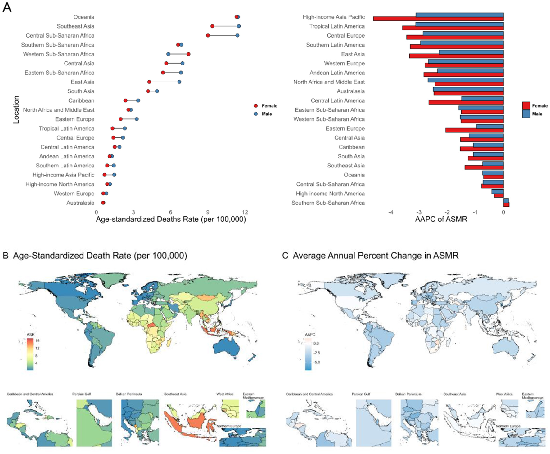 Global maps illustrated ASMR/ASDR disparities across 204 countries and 21 regions, while SDI-burden correlations delineated development-level associations.