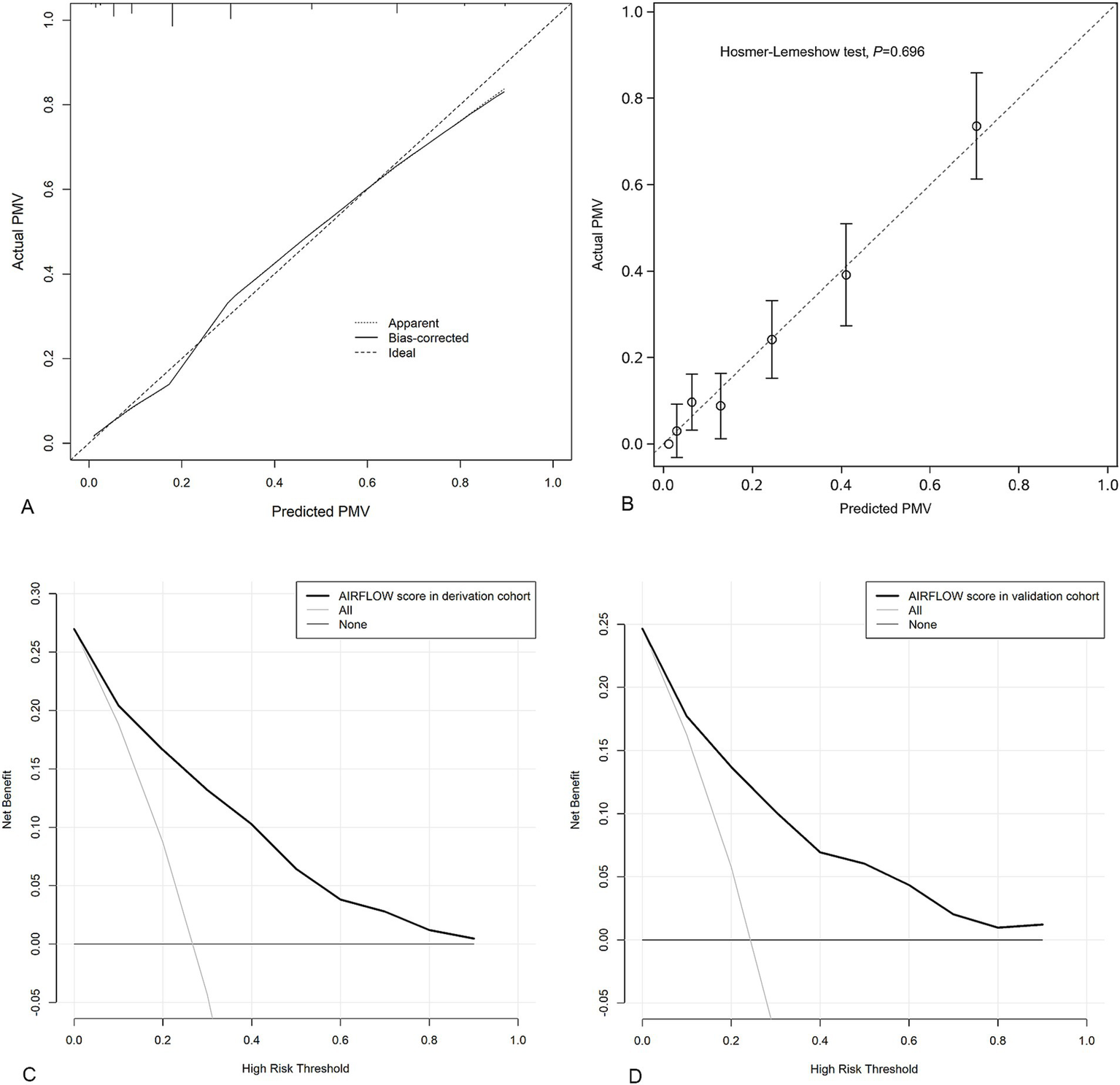 The derivation cohort consisted of 419 patients from four CSCs, among whom 113 (27.0%) required PMV. The presence of malignant cerebellar edema, posterior circulation collateral status, symptomatic intracranial hemorrhage post-EVT, atrial fibrillation, intravenous thrombolsis, vasopressor therapy and Glasgow coma score classification are found to be independent predictors of PMV in logistic regression, then ‘AIRFLOW’ scoring system was created. The AIRFLOW score demonstrated good discrimination in derivation cohort (C-index, 0.85, 95% CI 0.81 to 0.89), as well as the validation cohort (C-index, 0.82, 95% CI 0.77 to 0.86). Calibration plots and decision curve analysis for AIRFLOW score indicated that the model accurately predicted the risk of PMV and had satisfactory net benefit across various thresholds. Similar results were found in sensitivity analysis.