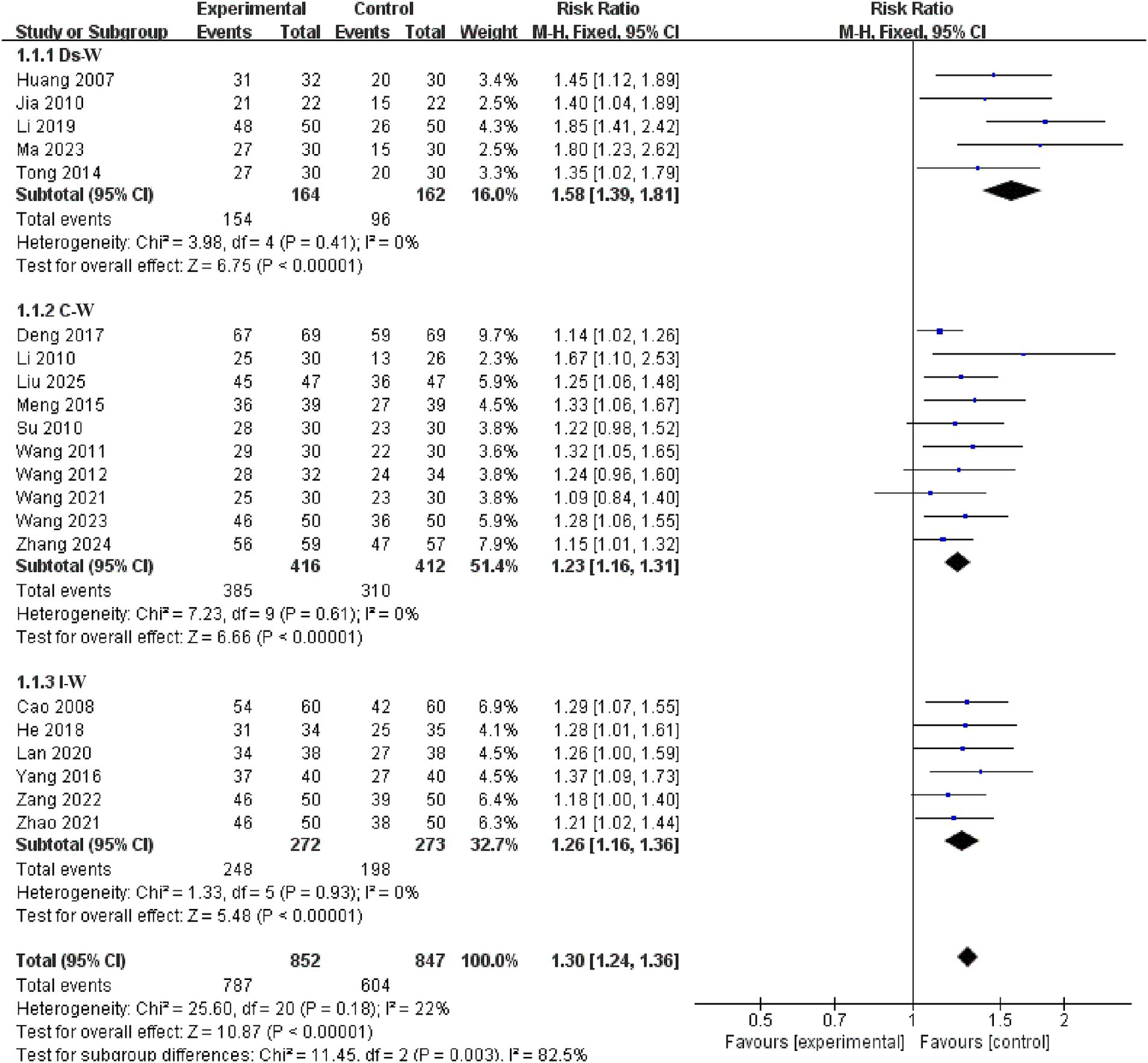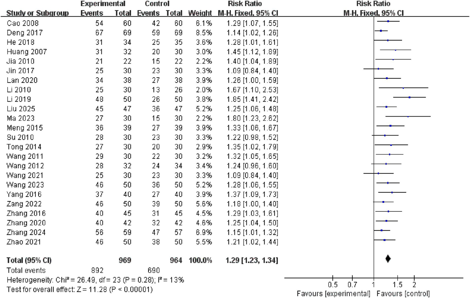 This research included 30 independent studies, 24 of which reported this specific result, and a subsequent meta-analysis using a fixed-effects model revealed that the efficacy of the electroacupuncture treatment group was significantly better than that of the control group (RR = 1.29, 95% CI: 1.23–1.34, I2 = 13%, 24 studies, 1933 participants). Furthermore, the results of the heterogeneity analysis revealed that these findings were reliable. See the Figure 5 for details.