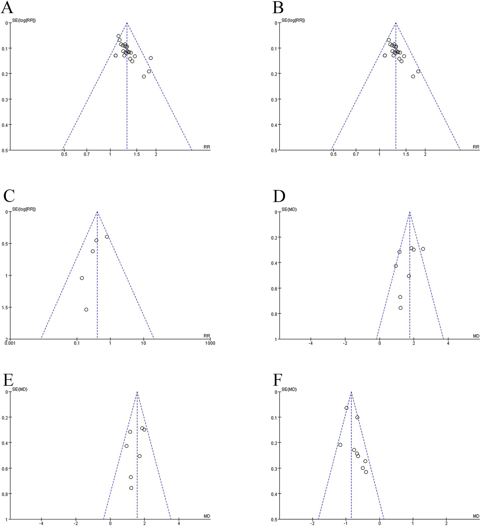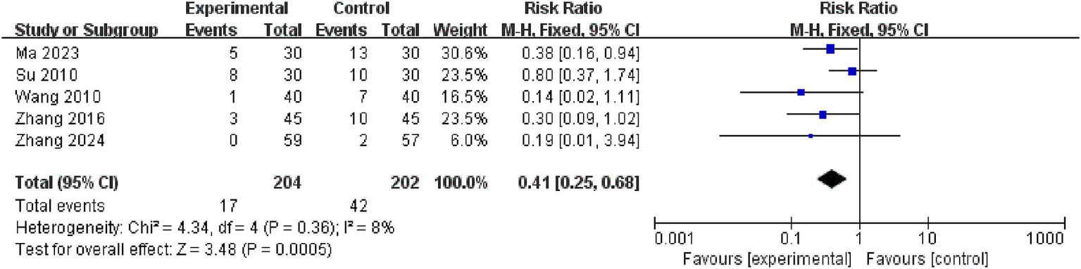 This study included 5 studies on adverse reactions to aspiration pneumonia. The meta-analysis of the included studies was conducted using a fixed-effects model, which revealed that the electroacupuncture treatment group outperformed the control group in reducing the occurrence of adverse reactions to aspiration pneumonia, with a statistically significant difference (RR = 0.41, 95% CI: 0.25 to 0.68, I2 = 8, 5 studies, 406 participants). Furthermore, the results of the heterogeneity analysis showed that these findings were reliable. See the Figure 6 for details.