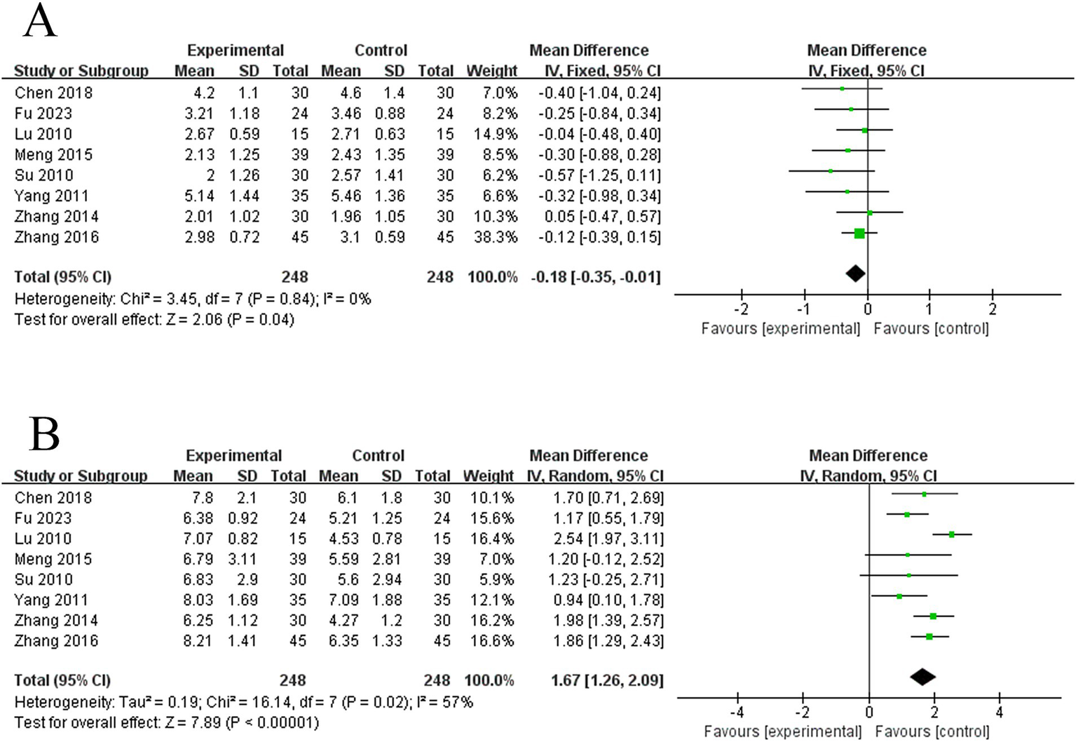 Forest plots of the WST scores. (A) Forest plot of WST scores for two groups before treatment. (B) forest plot of WST scores for two groups after treatment.