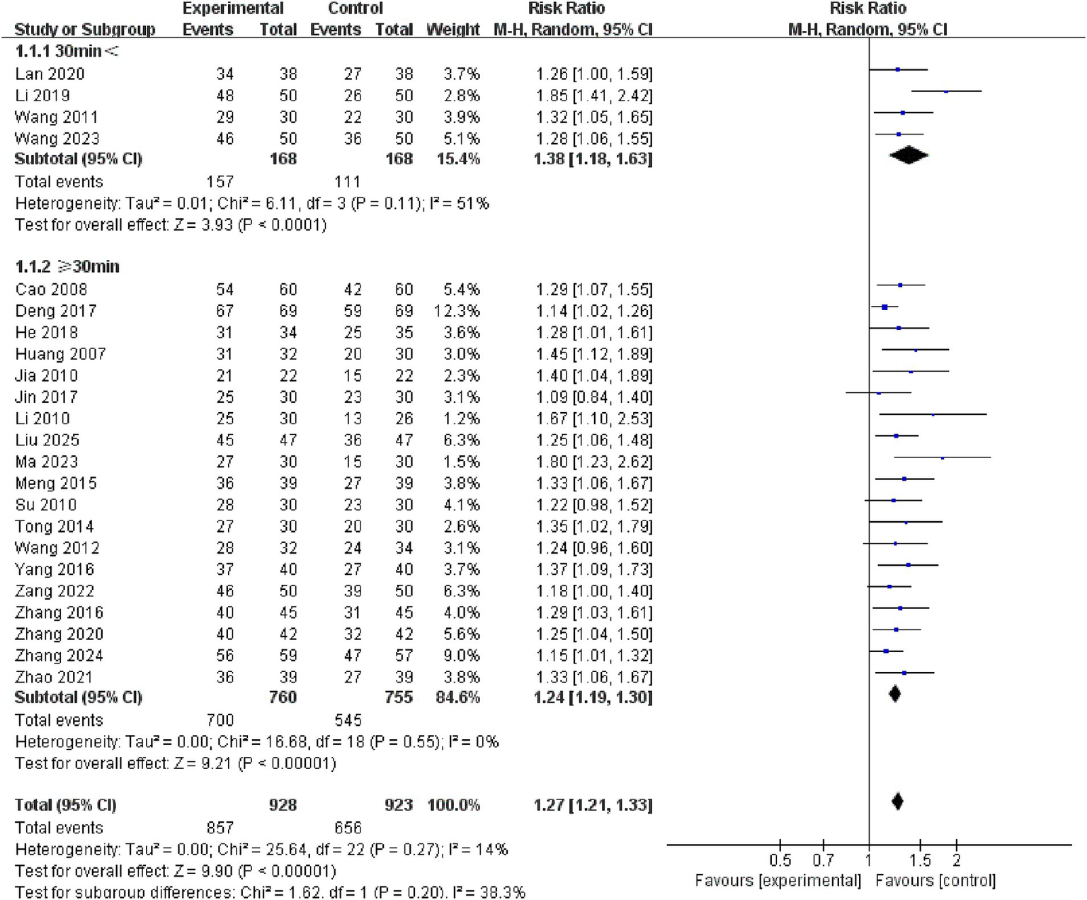 A subgroup analysis of single treatment time revealed no significant difference between the < 30 min and ≥ 30 min groups (p = 0.20). Nonetheless, studies in the < 30 min group (RR = 1.38, 95% CI: 1.18–1.63, p < 0.00001) and the ≥ 30 min group (RR = 1.24, 95% CI: 1.19–1.30, p < 0.00001) showed higher effect sizes than the control group. See the Figure 9 for details.