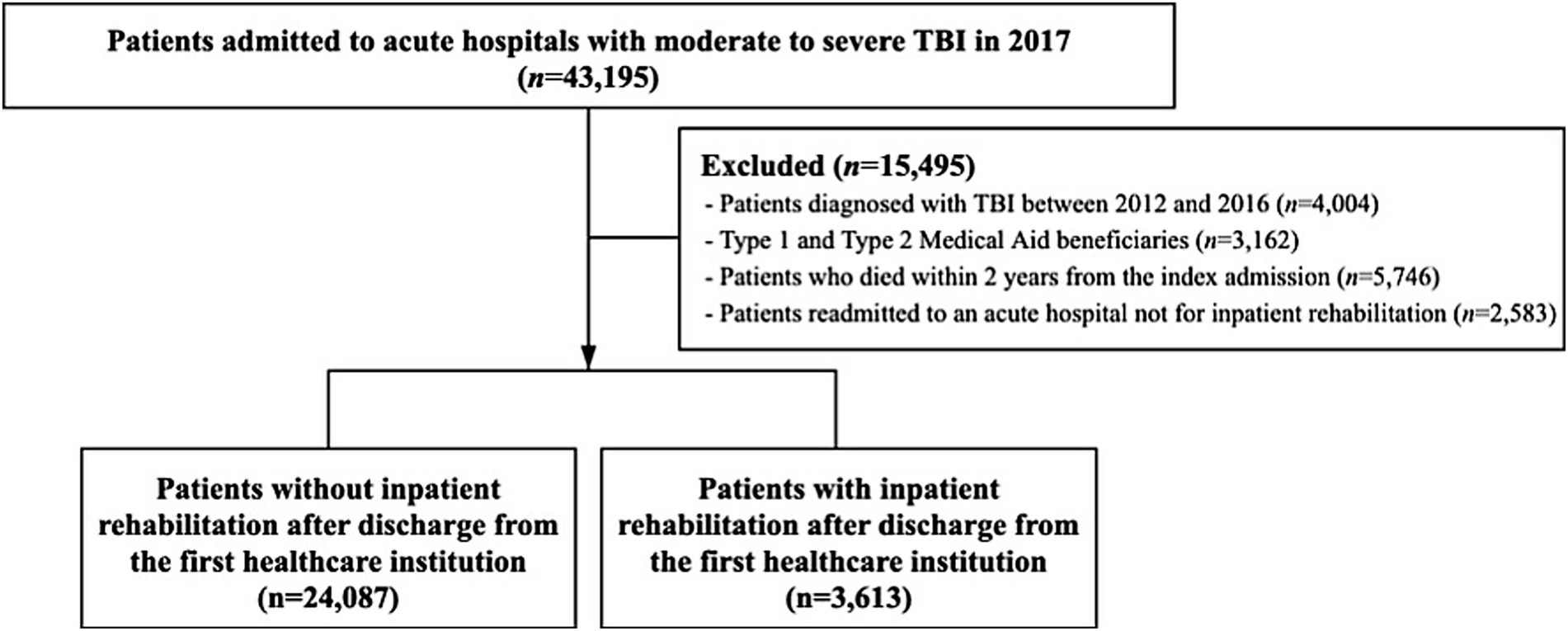 In this study, we aimed to examine the utilization of inpatient rehabilitation services among individuals who experienced TBI in 2017, before the introduction of the specialized rehabilitation hospital system, using data from the Nationwide Health Insurance Database (NHID), a large-scale administrative dataset.