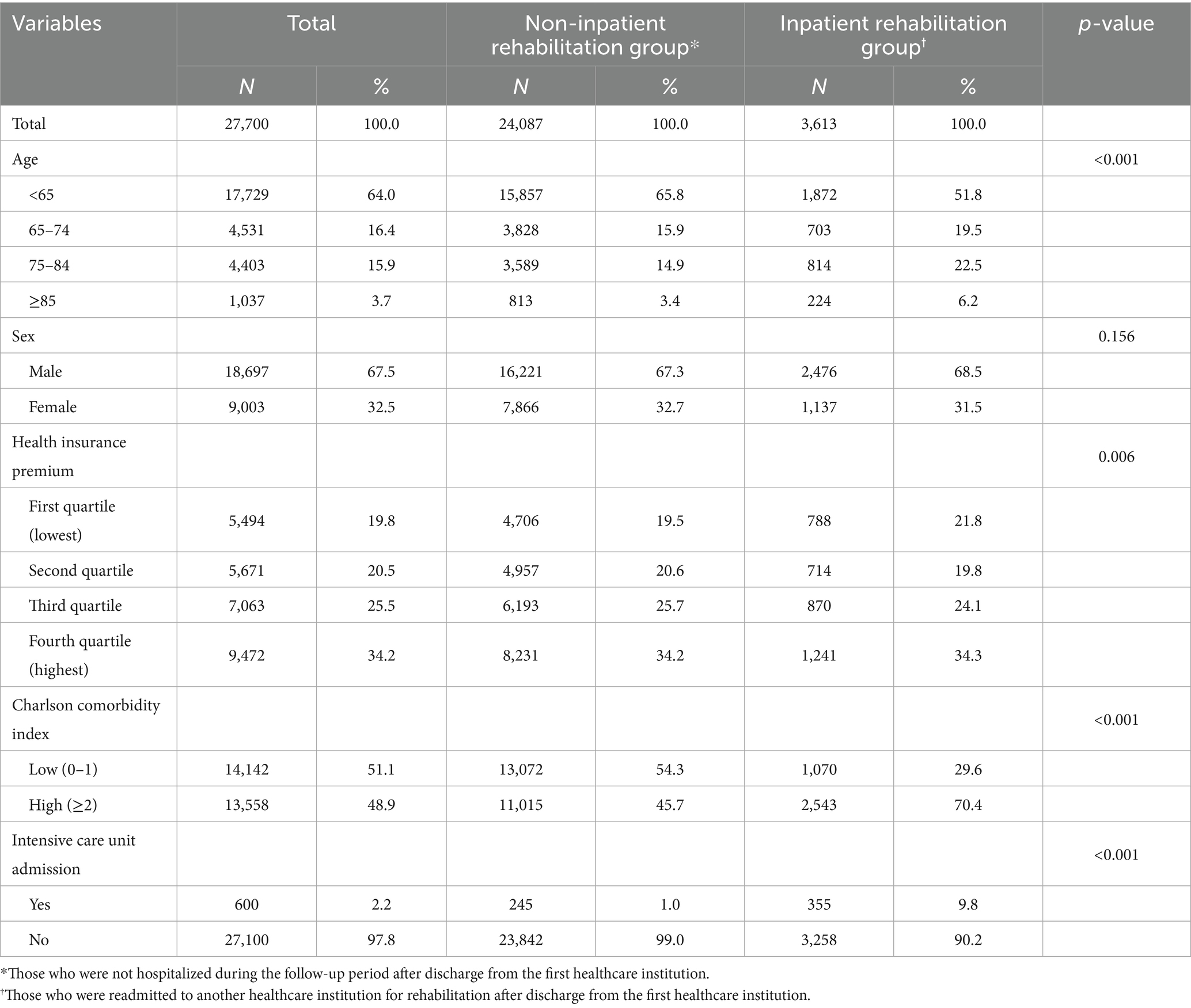 The sociodemographic characteristics of the group that did not receive inpatient rehabilitation (i.e., those who were not hospitalized during the follow-up period after discharge from the first healthcare institution) and the group that received inpatient rehabilitation (i.e., those who were readmitted to another healthcare institution for rehabilitation after discharge from the first healthcare institution) were compared using the chi-square test (χ2 test).